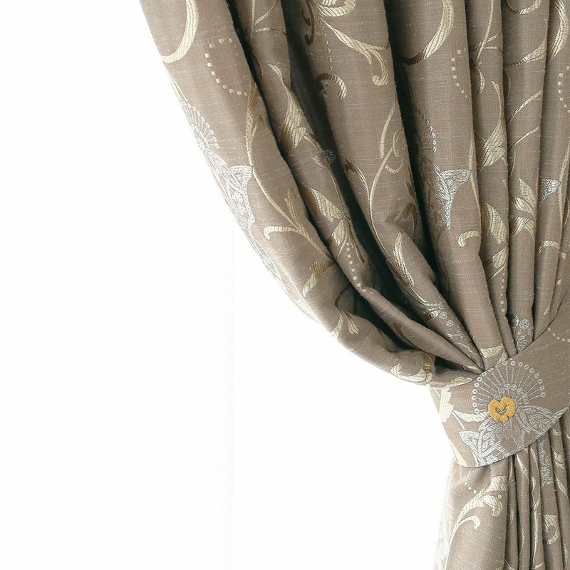 カーテンを束ねる「タッセル」には、ゴールドの輝きが美しし刺繍糸でミラ・ショーンのロゴをデザイン。カーテンを束ねるだけで、アクセサリーを施したようなエレガントな窓辺を演出します。