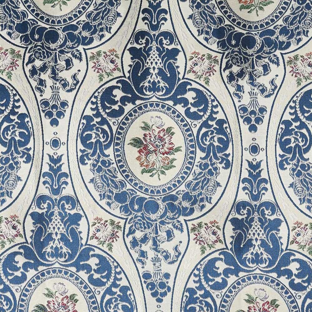 高級感のある先染めのアイボリー糸と落ち着きのあるロイヤルブルーを組み合わせた、精巧で美しいメダリオン模様のカーテン。その繊細な表情は、お部屋に高貴なムードを演出します。