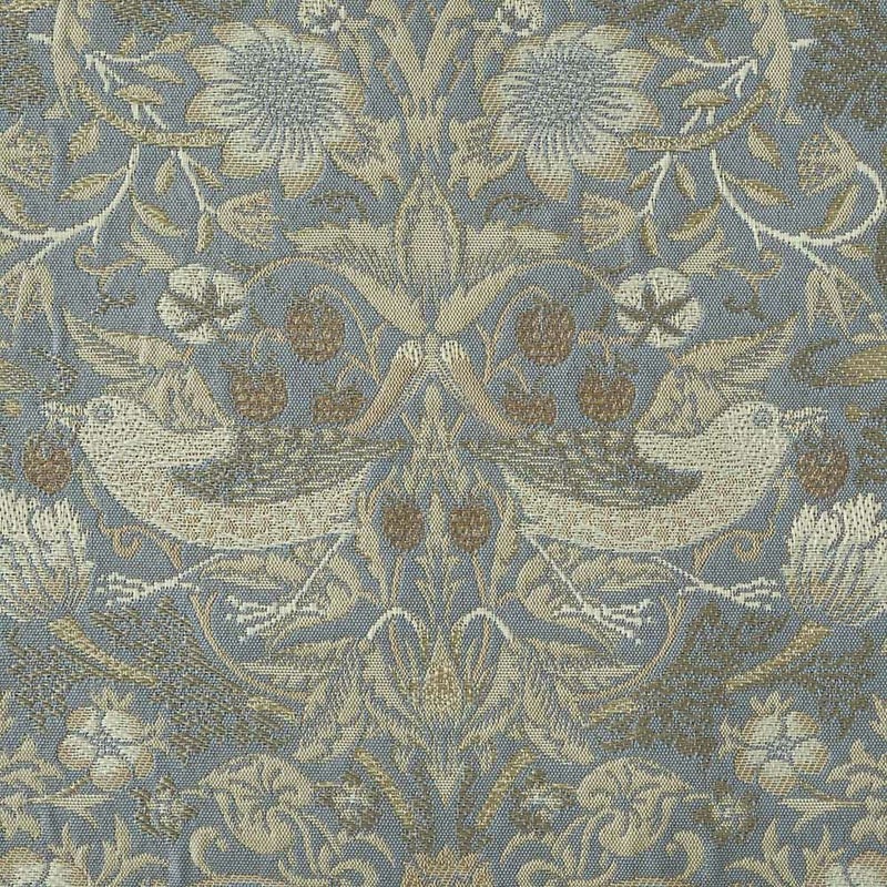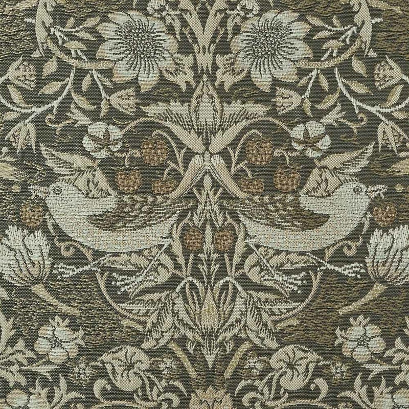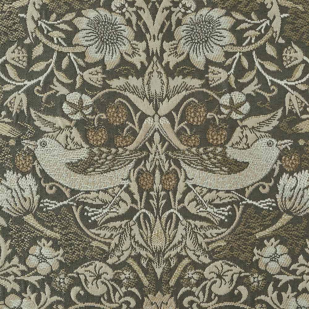「イチゴ泥棒」はモリスの中でももっとも有名なデザインのひとつです。この図案はモリスの別邸ケルムスコット・マナーの菜園にいちごを盗みによくきていたツグミが元になっています。モリス商会が販売する内装用ファブリックの中でも最も高価なものであったにも関わらず、非常に人気のある図案でした。