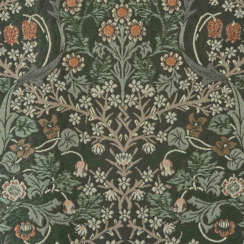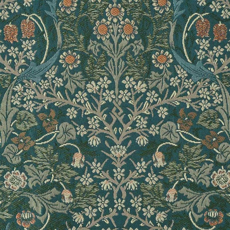 1892年に壁紙としてデザインされたこの図案は、ウィリアム・モリスとJ.H.ダールの共作だと考えられています。全体の構図にはダールらしさがあり、小さなデイジーや渦巻く葉にはモリスらしさが感じられます。棘があり、春には白い花が咲き、秋には黒い実がなるブラックソーンは英国らしい生垣を連想させます。