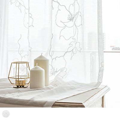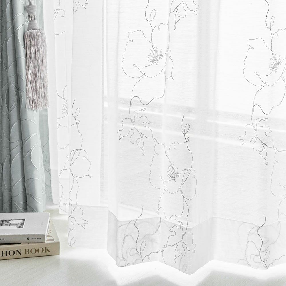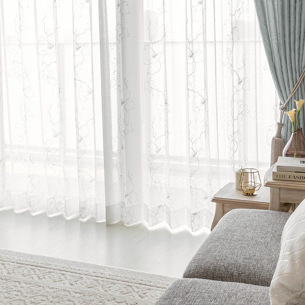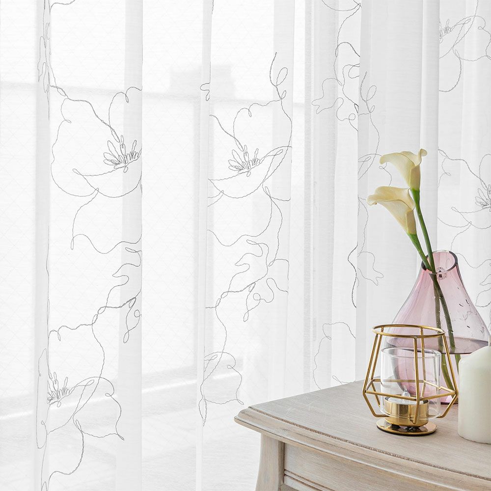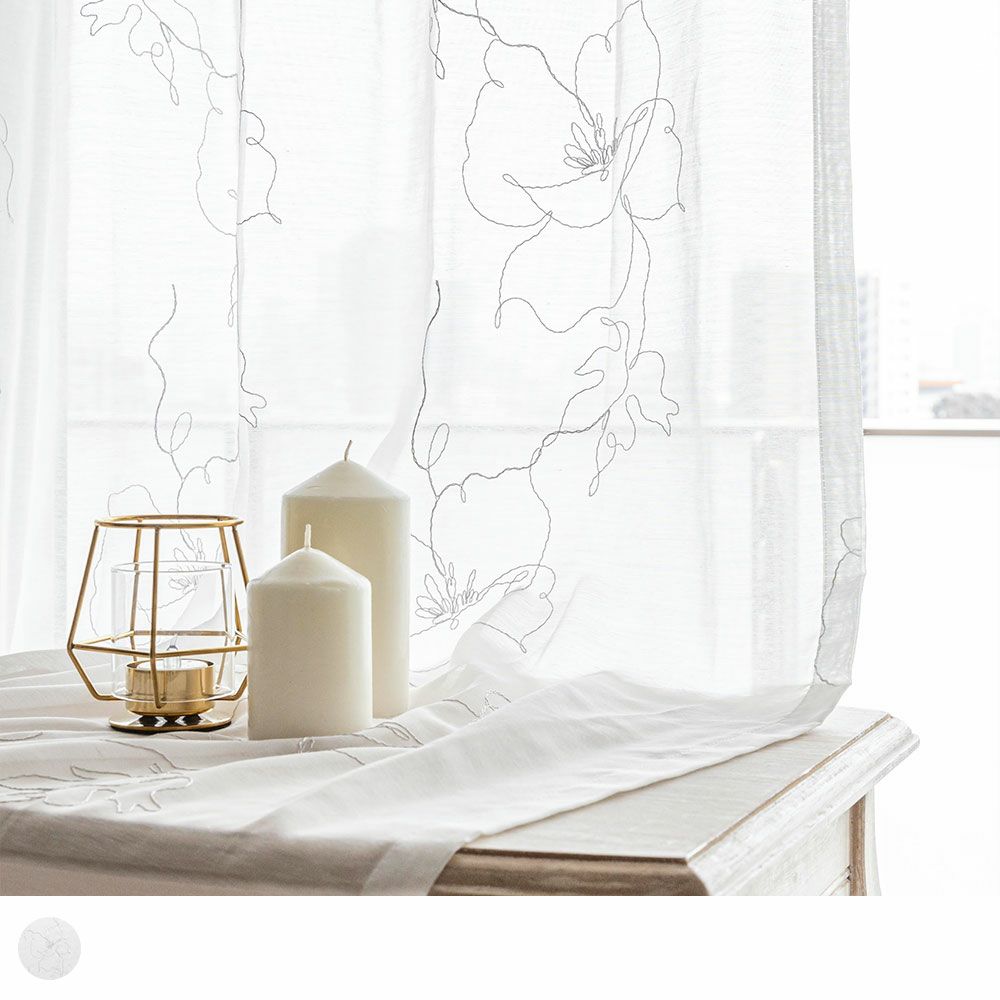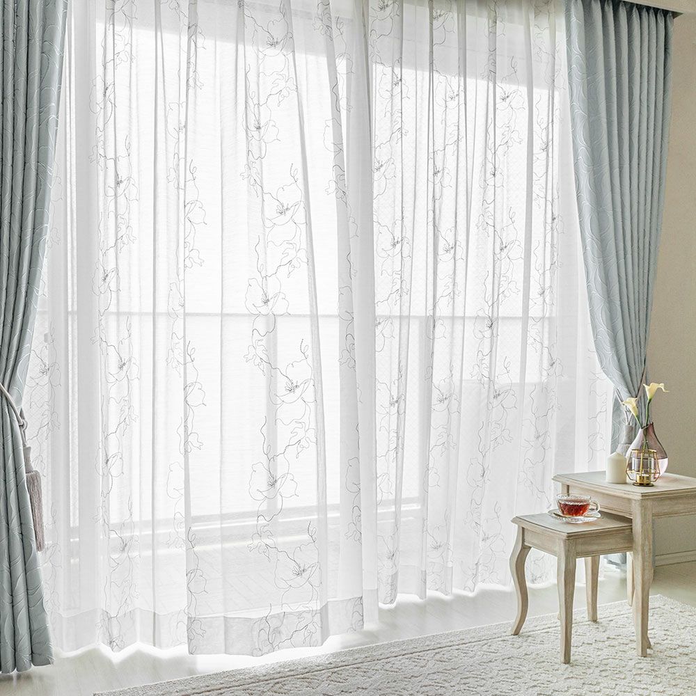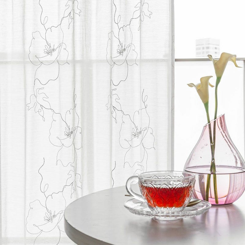 心地よい風に、ふわりと揺れる美しいレースカーテン。ラインアートのように、繊細に描かれた花々が浮かびあがる一枚は、心華やぐひと時を彩ります。