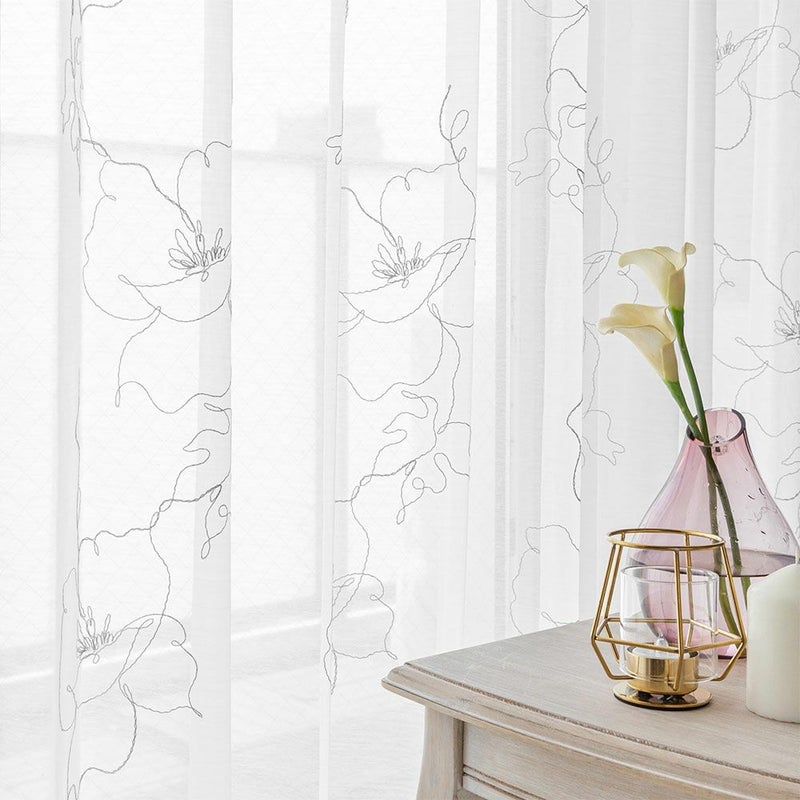 手書きのような柔らかなラインで描かれたフラワーモチーフが、愛らしく上品なシアーレース。窓にかける前から惚れ惚れするような、可愛すぎる一枚です。 -