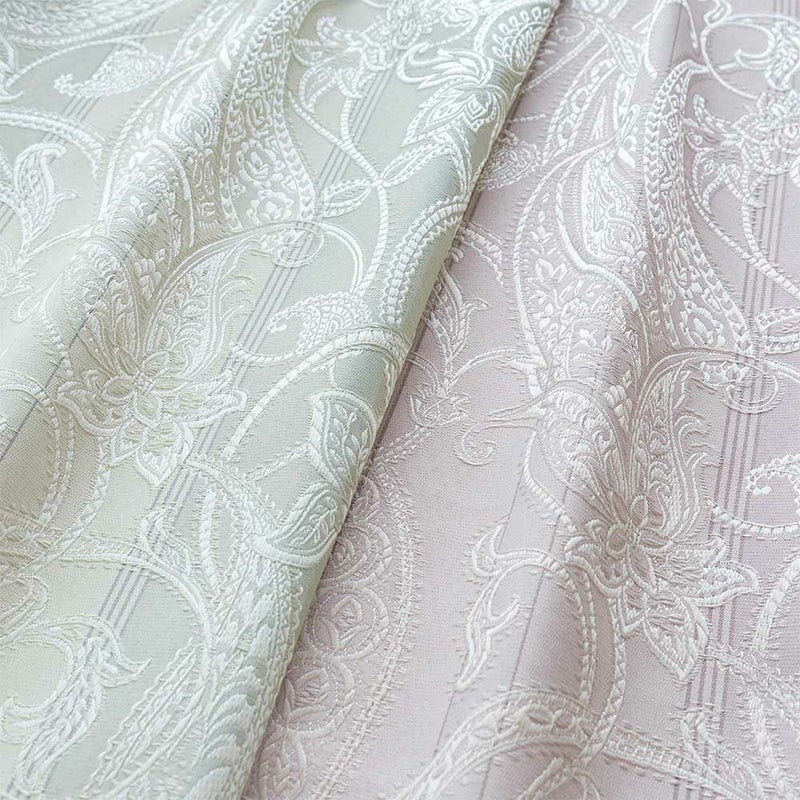 スモーキーなグリーンは大人っぽく、心に癒しを与えるカラー。色の濃淡で表現されたグリーンストライプと、浮かび上がるペイズリー模様が上品さをプラス。
