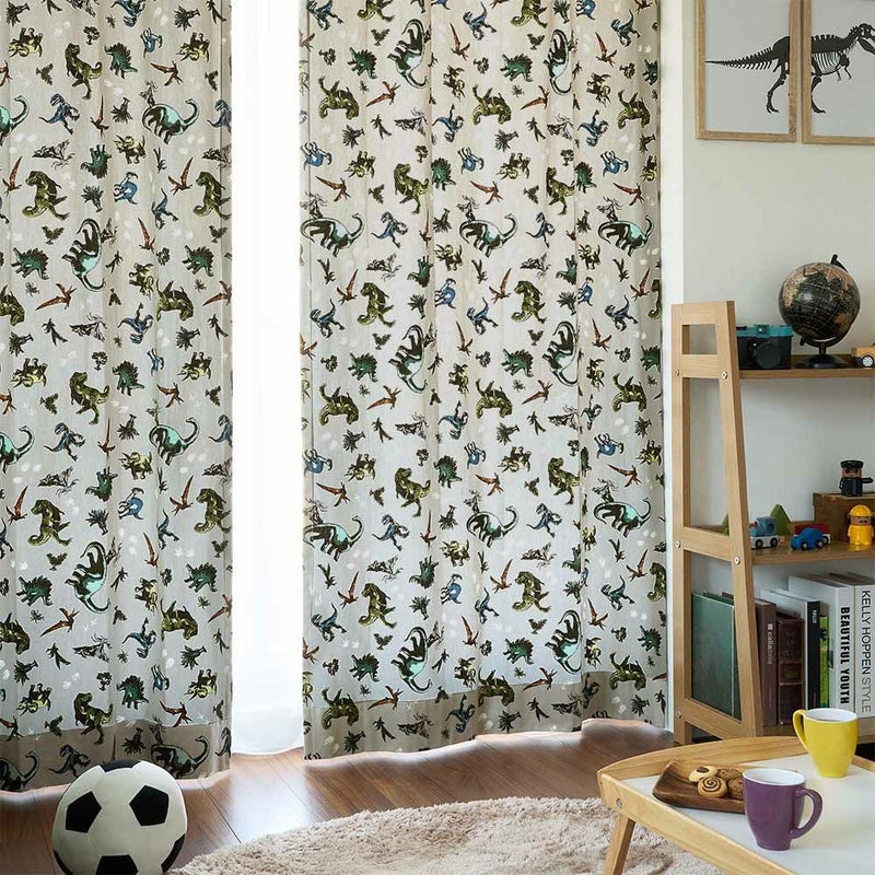 【撮影コーディネート】レースカーテン <コモン ホワイト>ガオーっと吠える声が聞こえてきそうな恐竜カーテン。ティラノサウルスやトリケラトプスなどたくさんの恐竜たちが、まるで本物みたいで強くてカッコいい!大好きな恐竜たちに囲まれて、ワクワクドキドキな毎日が始まるよ!