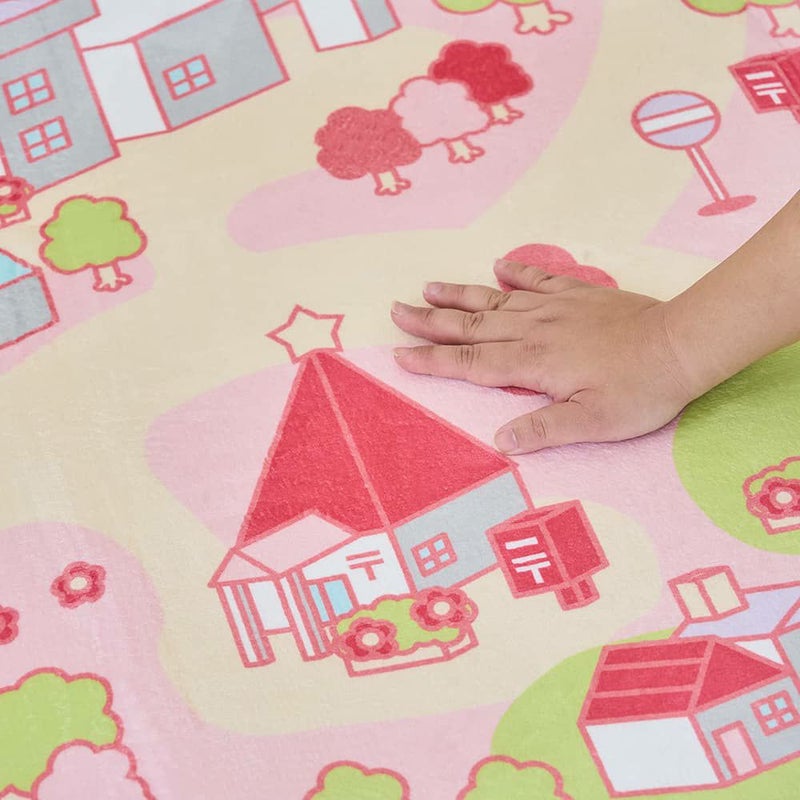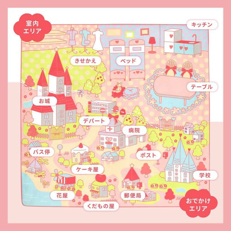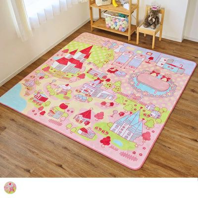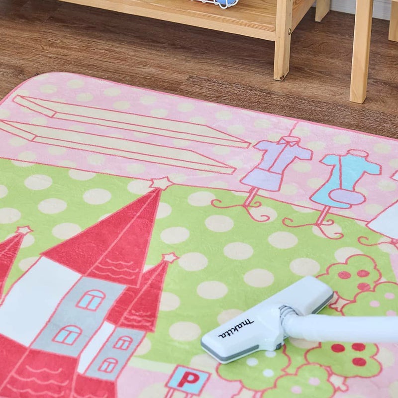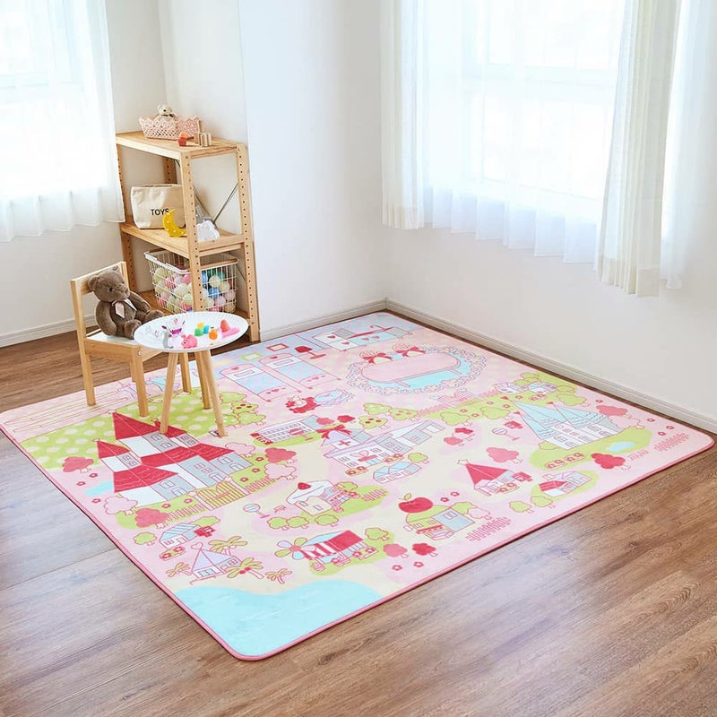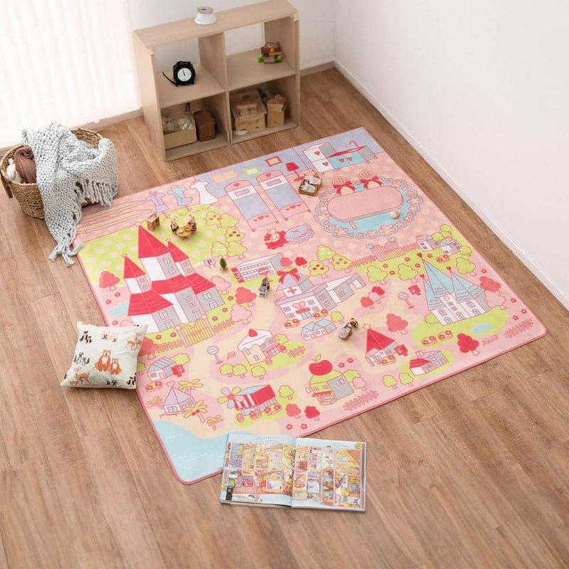 お城やリボンなど女の子に人気のかわいいイラストがあしらわれた遊べるキッズラグ。キッチンやベッドなどのお家エリア、学校や病院などのお出かけエリアと分かれており、おこさまの想像力や遊び心をくすぐります!