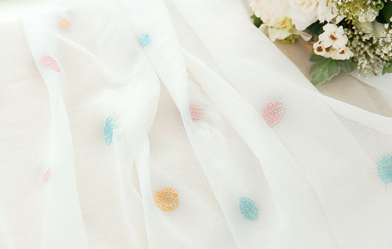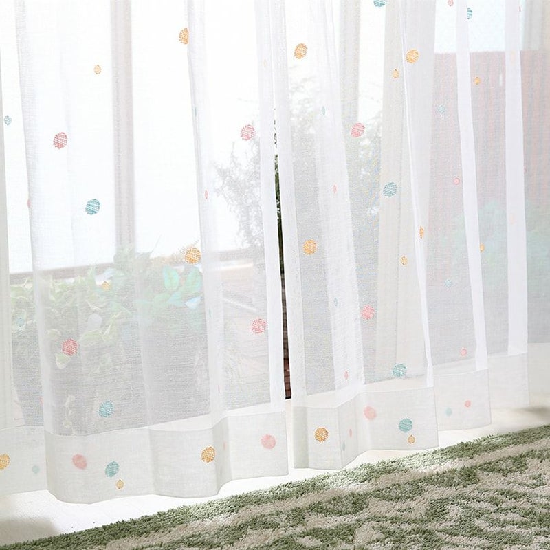 子供達がそーっと吹いて飛んで行った泡が、消えないようにカーテンの中に色を付けて飛び込んでいったようです。遊び心と夢のあるデザインが可愛いレースカーテン。 -