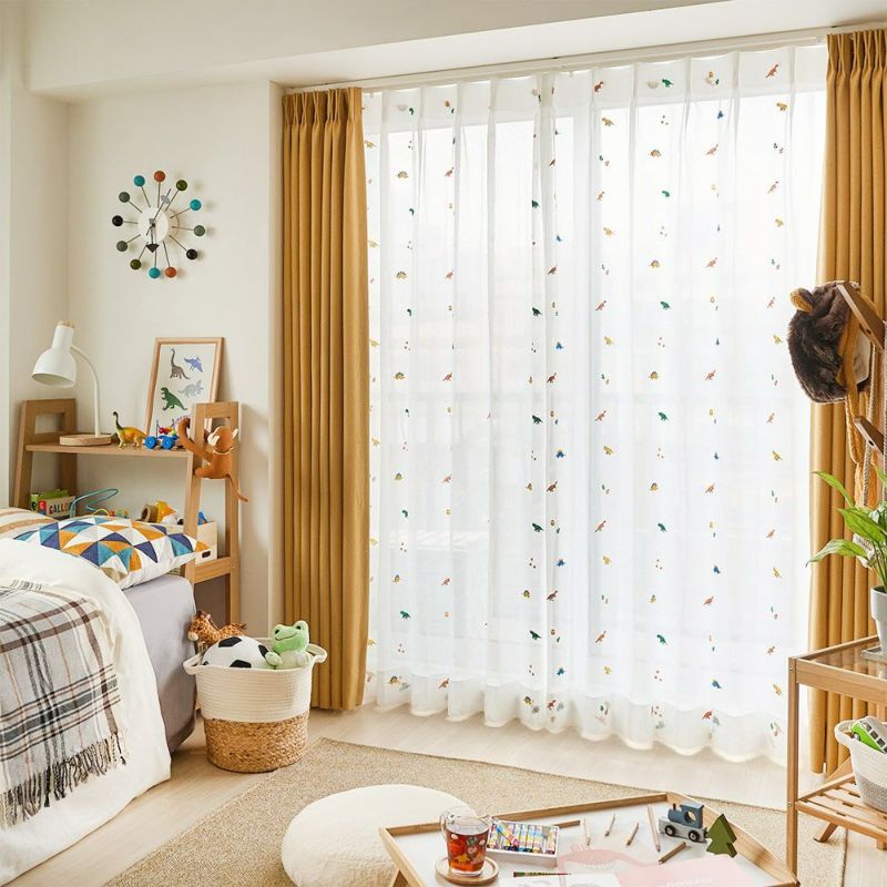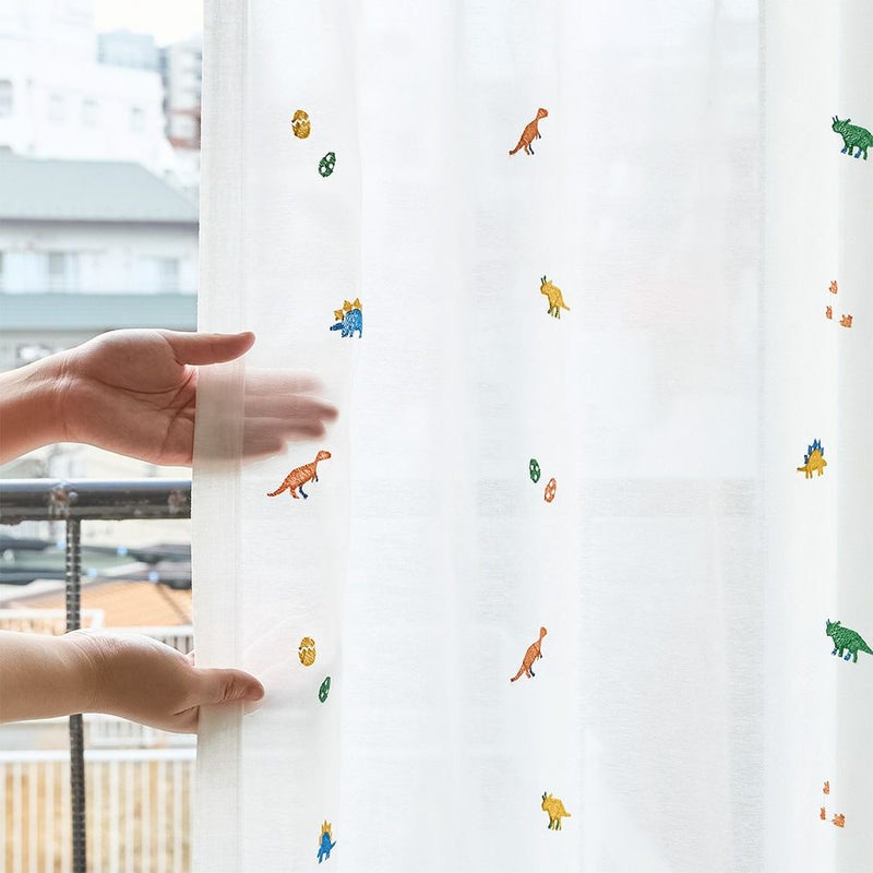 トリケラトプスや、ティラノサウルス。大好きな恐竜たちがカーテンに集合!真っ白なレースカーテンに描かれたカラフルな恐竜たちに目を奪われるデザイン。大人も子供も楽しめる、恐竜好きにはたまらない1枚です。