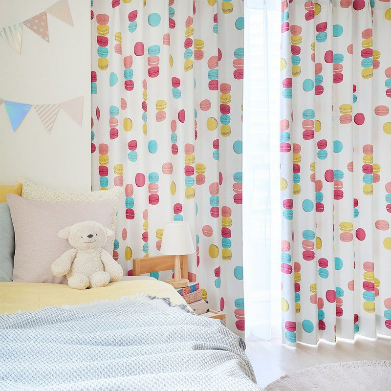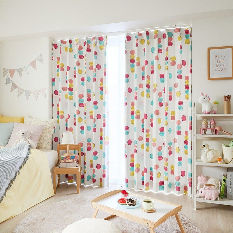 ポップでキュートな遮光カーテン「マカロン」。かわいいマカロンに囲まれれば、おやつタイムもお友達と過ごす時間ももっと楽しい!子供部屋がワクワクがあふれる、素敵な空間になりますように。