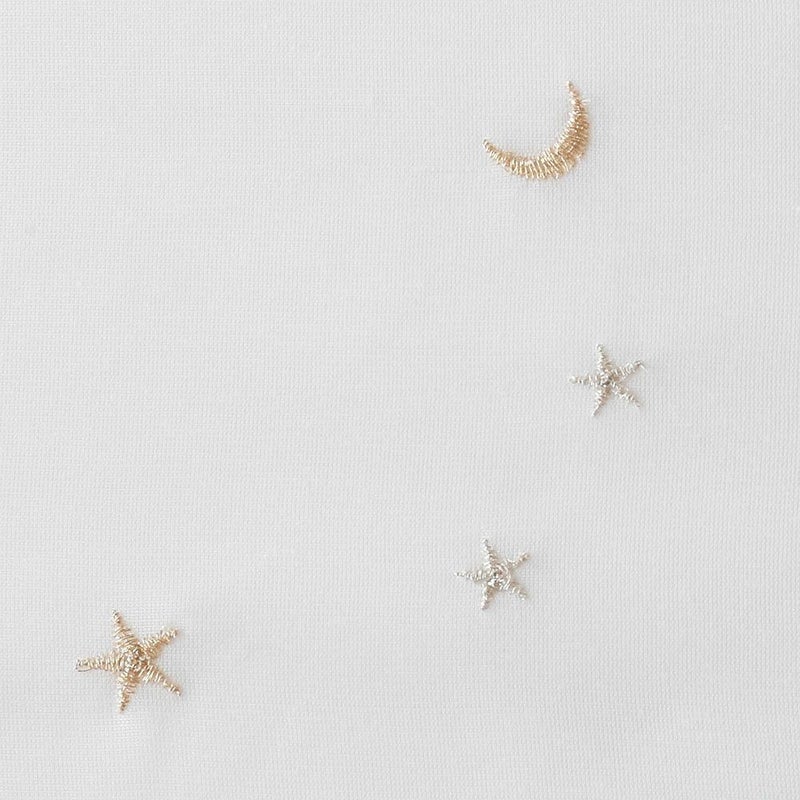 ゴールドとシルバーの糸で描かれた、お星さまとお月さまの刺繍がかわいい!派手過ぎず、さりげない輝きに、思わずキュンとしちゃいます。