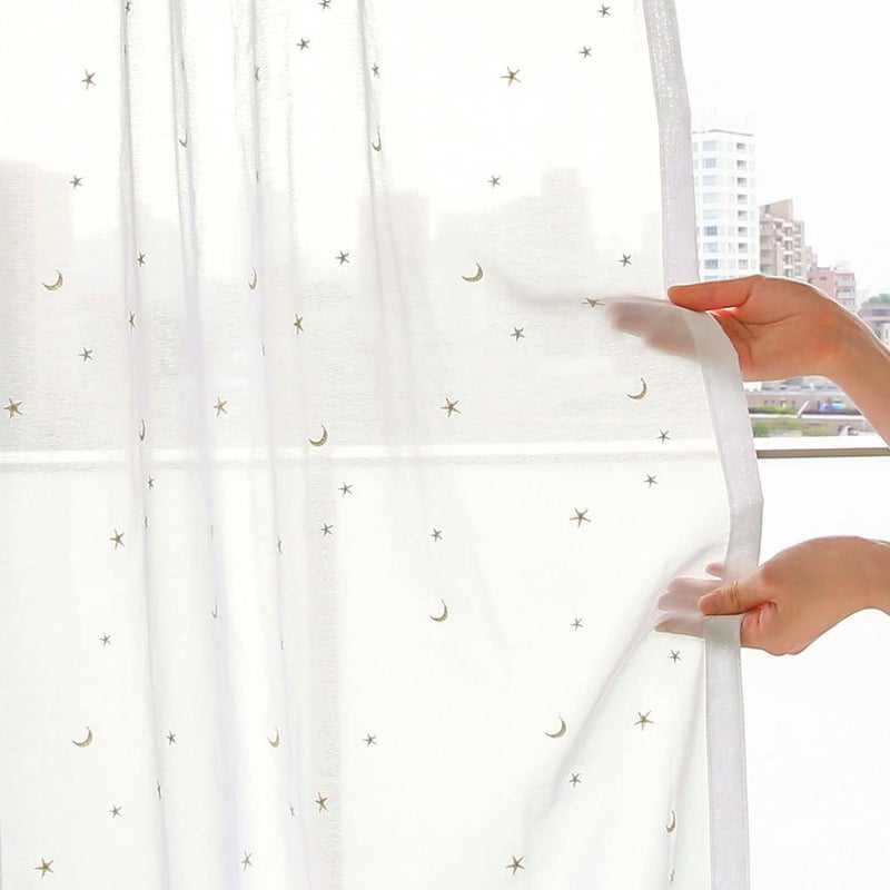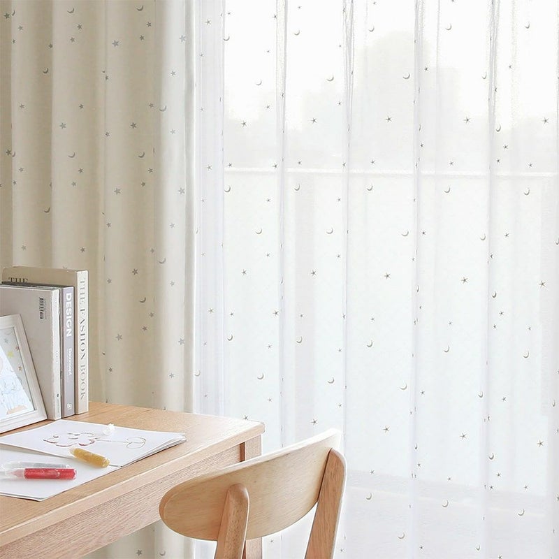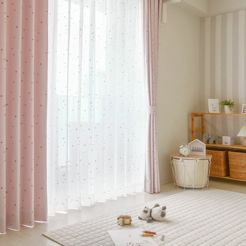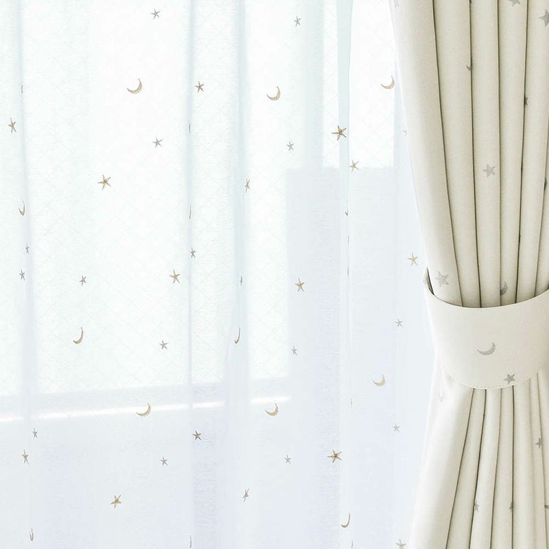 ふんわりやさしいボイルレースに、キラキラ光るお星さまとお月さまを刺繍で描いた1枚。レースカーテンを見るたびに「か、かわいい…!」と思わず見とれちゃう!心がワクワクする、子供部屋にピッタリなレースカーテンです。