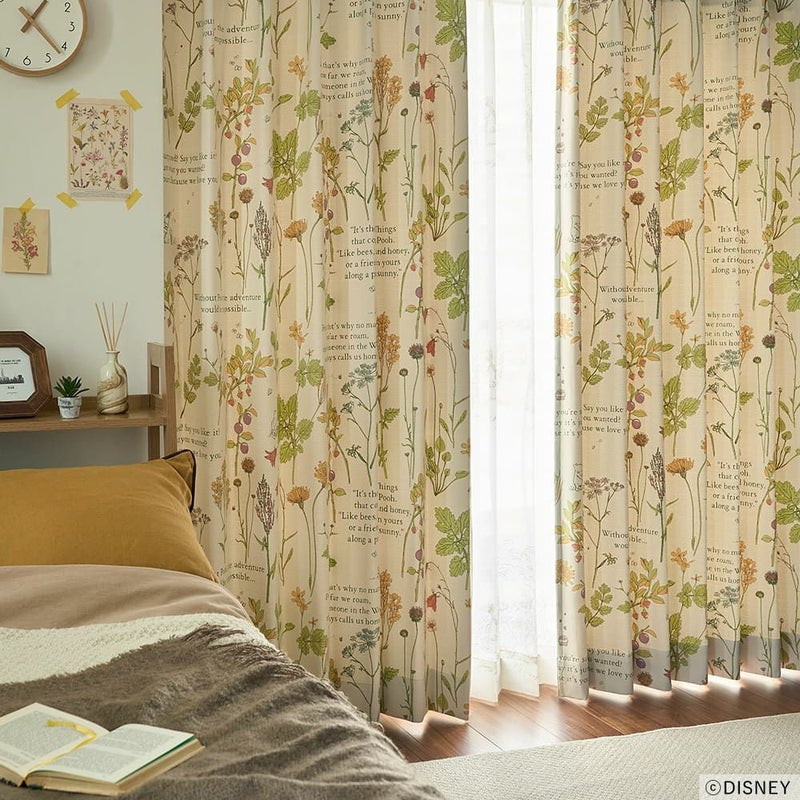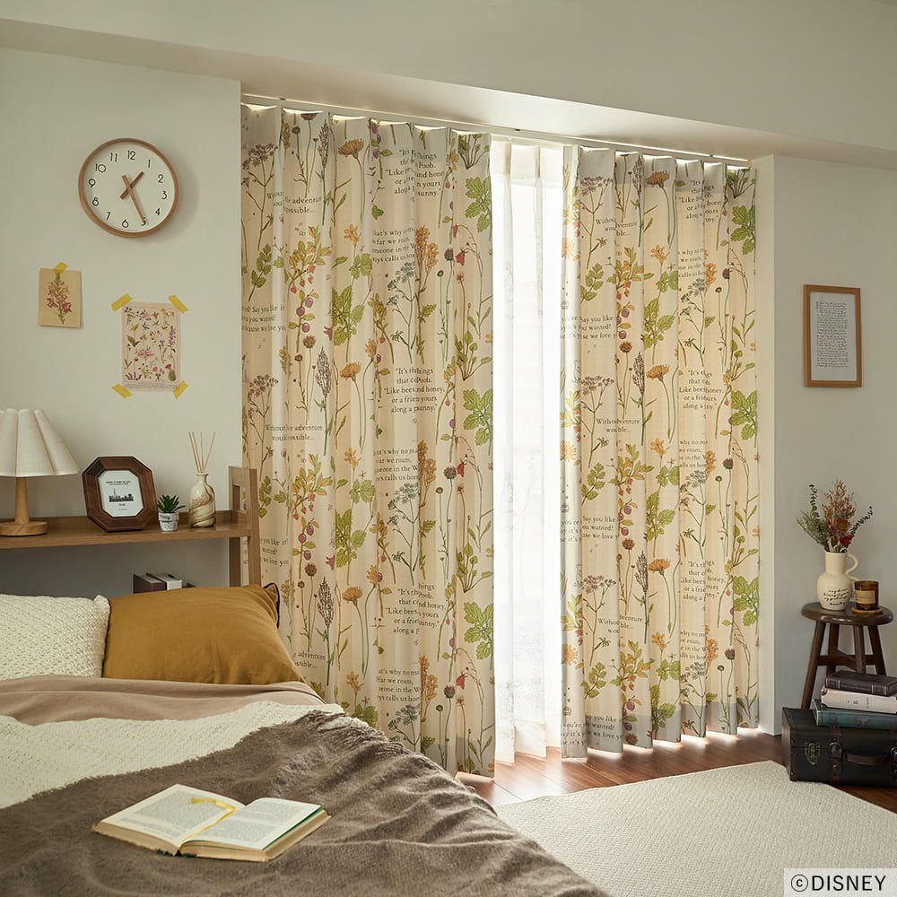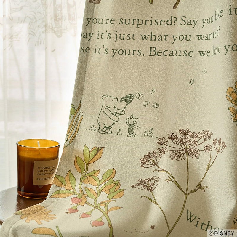 【撮影コーディネート】ボイルレースカーテン <シークレット ベージュ>カーテンいっぱいに描かれた美しい野の花と、その間で蝶々たちとのんびり過ごすプーさん。森の中でのワンシーンを切り抜いたような、優しいデザインの遮光カーテンです。お部屋の雰囲気はもちろん、心までほっこりと穏やかな気持ちにさせてくれそうな1枚です。