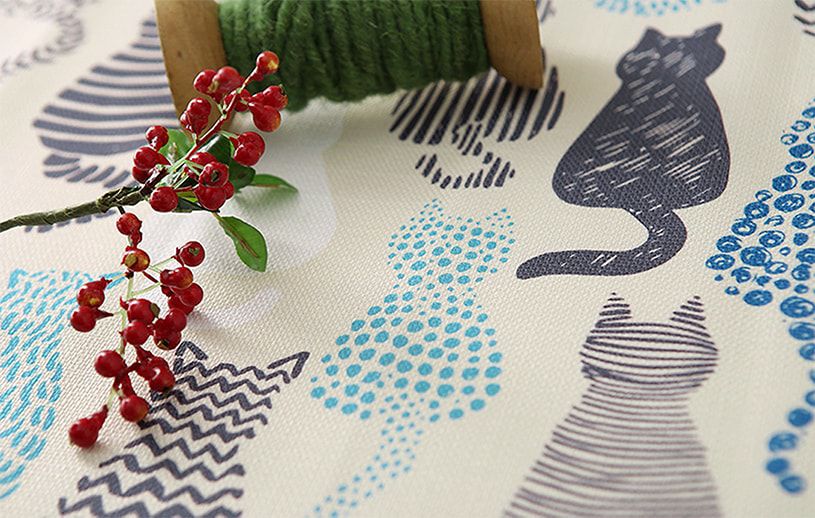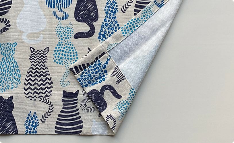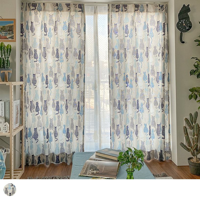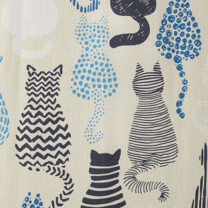 ブルートーンの様々な模様で描かれた猫柄のカーテン。