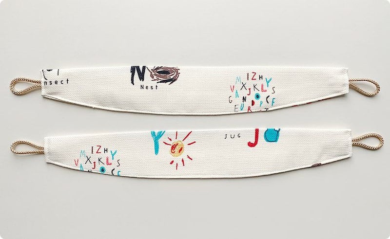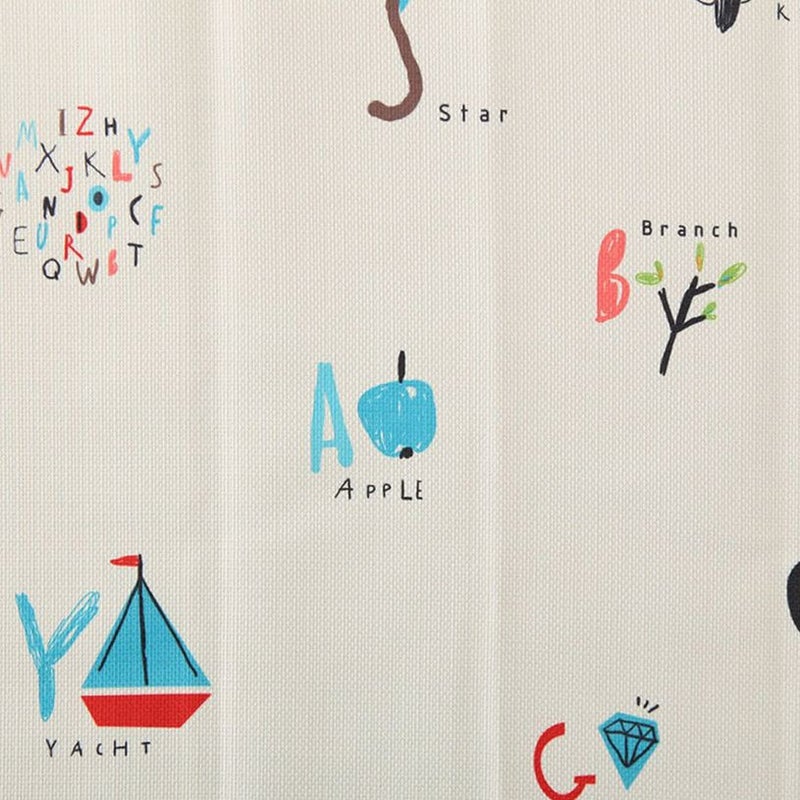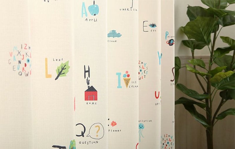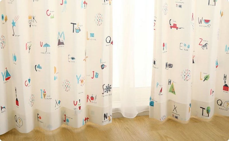 アルファベットと一緒に可愛い絵がデザインされたカーテン。