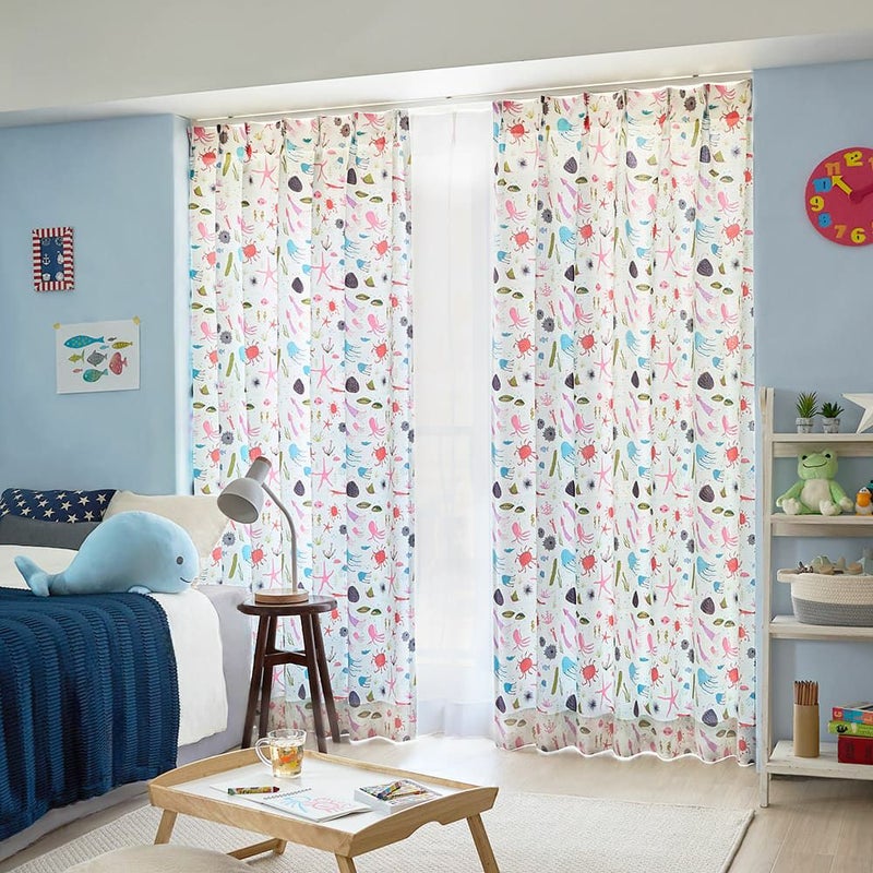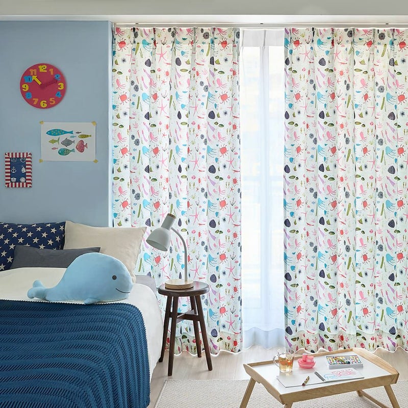 まるで海の中にいるような、カラフルな海の生き物柄カーテン。タコやイカやクラゲなど海の生き物たちが、ワイワイと楽しそう。大好きな海の仲間たちと一緒に、ワクワクする毎日が始まります!