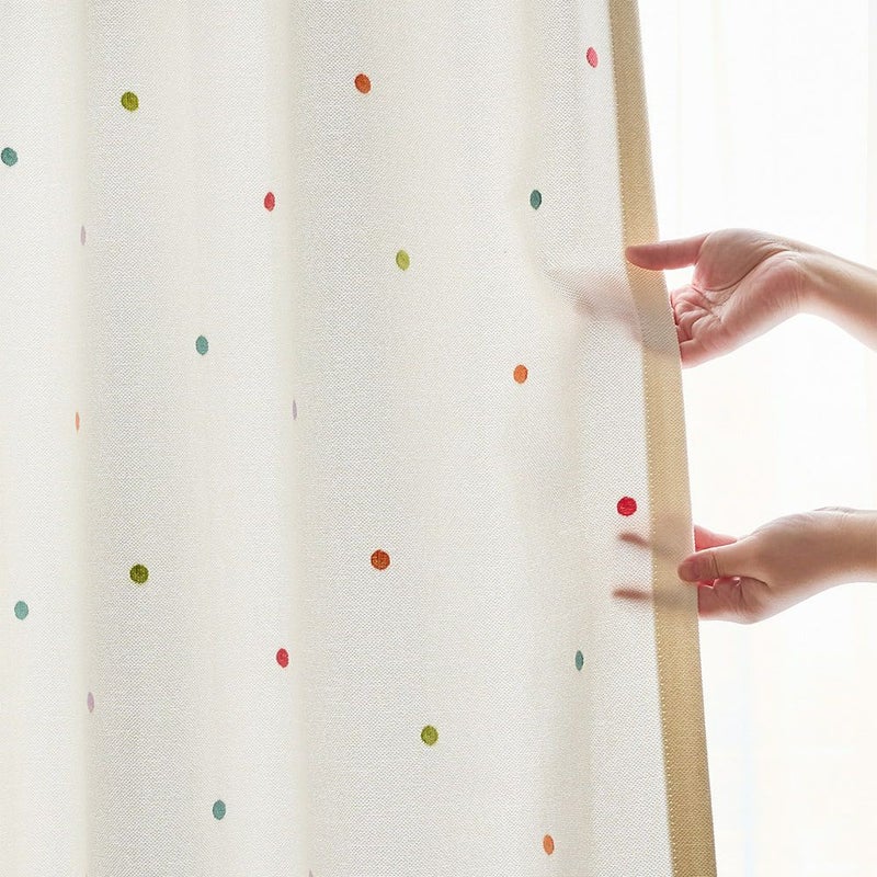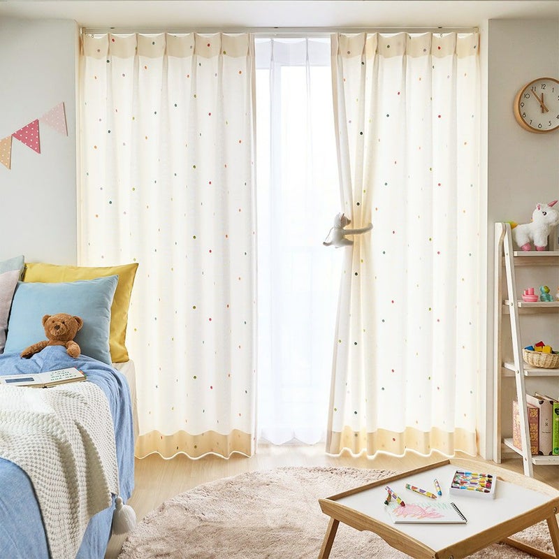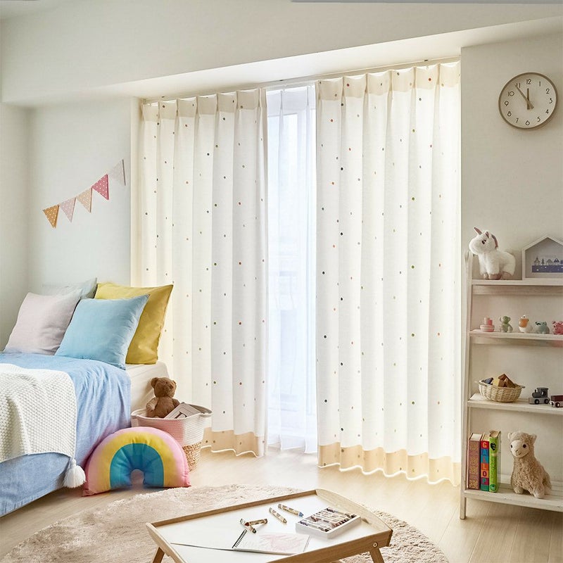 ポップでキュートなドット柄カーテン。明るく賑やかな子供部屋で、今日も1日ハッピーに過ごせそう!大切なお子様がめいっぱい楽しく、のびのびと過ごせる。そんなワクワクする子供部屋になりますように。