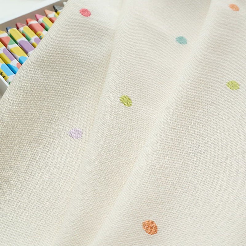 ドット模様はプリントではなく、オーダーカーテンならではの刺繍で表現した、こだわりの一枚。子供時代は感性を養う大切な時期だからこそ、ポコポコした立体感やこだわりを感じるテキスタイルにも触れてほしいですね。