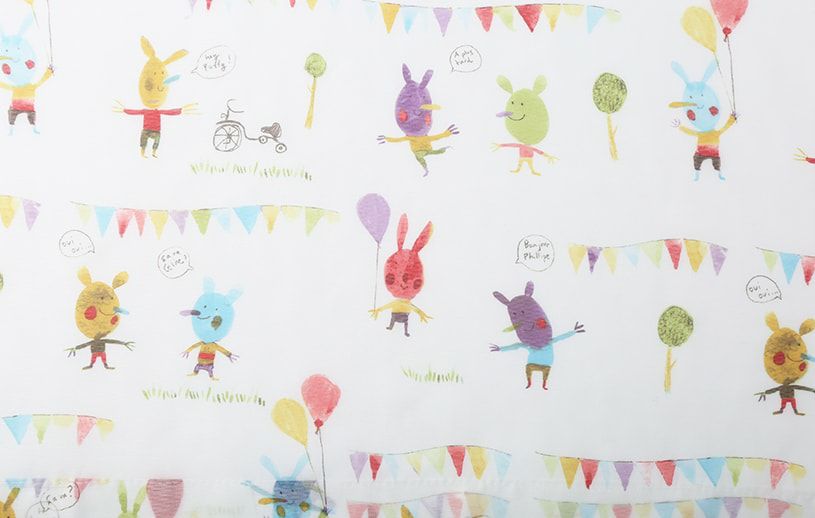 可愛い小人達が、みんなで楽しく遊んでいる様子が描かれた、ポップで楽しいデザインのレースカーテン。