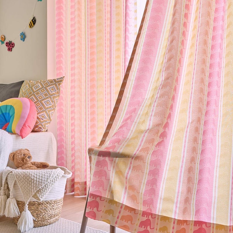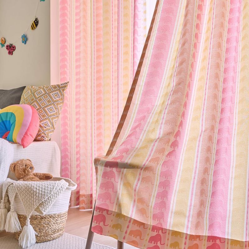 【撮影コーディネート】 タッセル :<アニマルタッセル>※こちらは売り切れました子供たちの大好きなぞうさんがいっぱい並んだカーテン。カラフルでかわいいぞうさんたちが、みんなでおさんぽしているみたい。大好きなぞうさんに囲まれて、毎日がワクワク楽しくなりそう!
