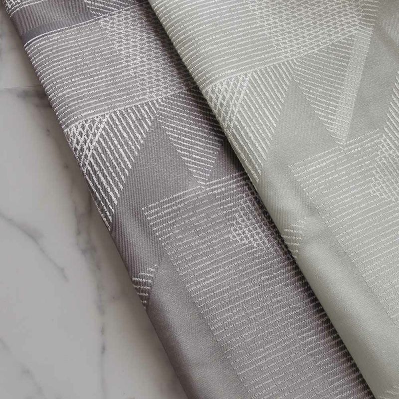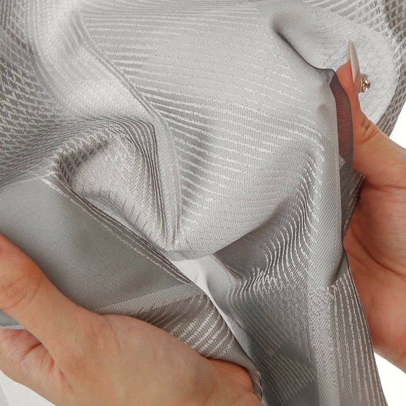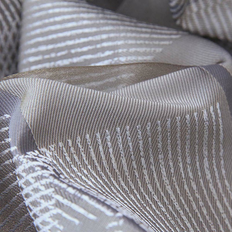 生地を近くで見るとプリントとジャカードを組み合わせ、さらにオーガンジー生地を重ねた風通組織。ライトグレーは薄いグレーのオーガンジー、グレーはゴールドに近いオーガンジーを重ね、上品な高級感を感じさせます。