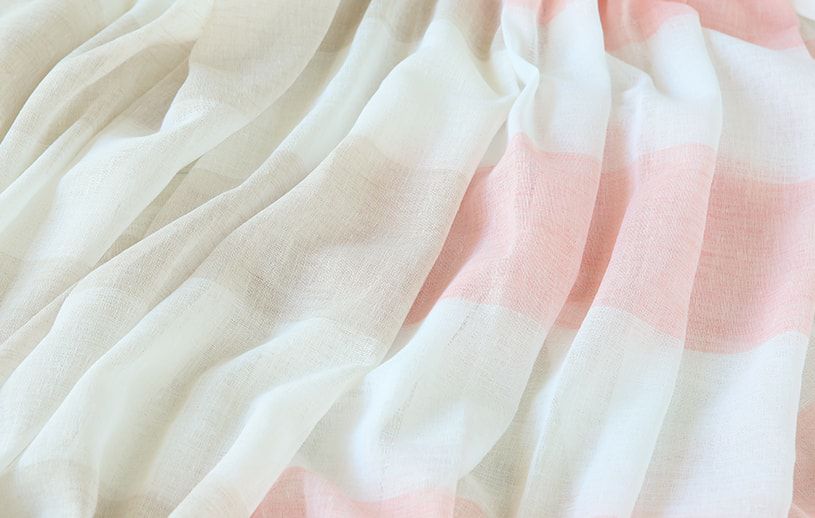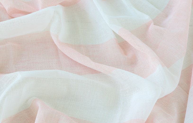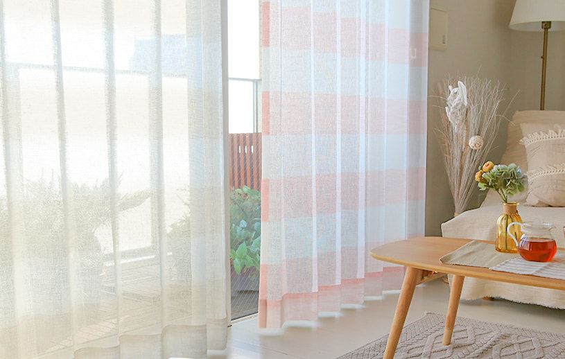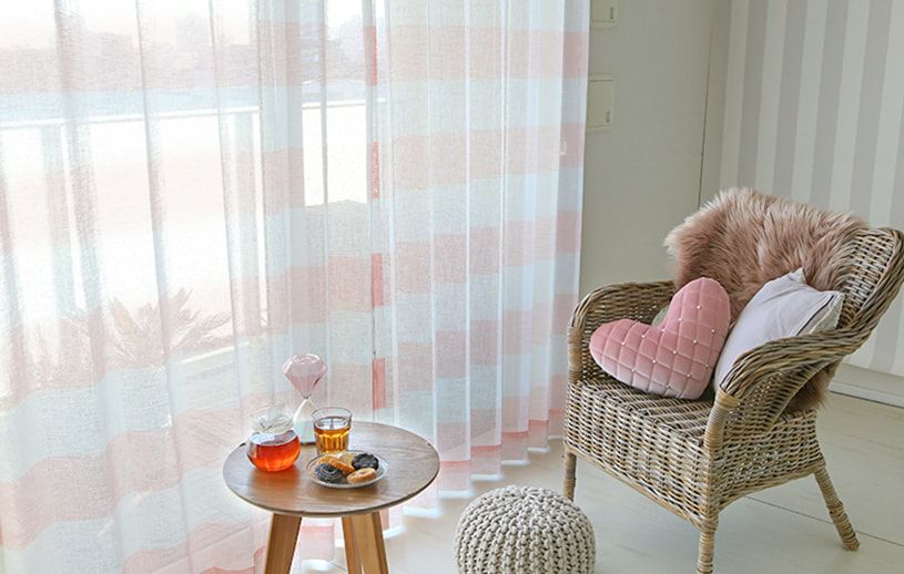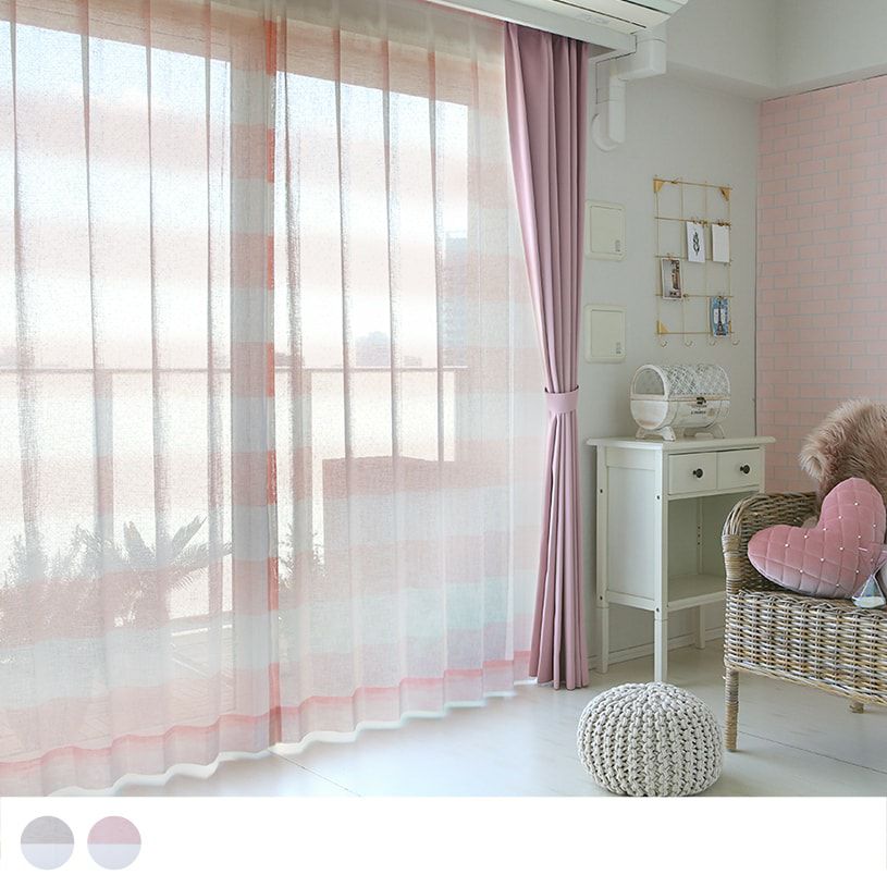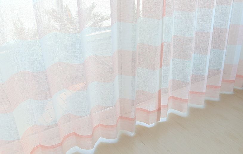 柔らかい印象を与えるベージュとピンクが、キュートなボーダーと調和したレースカーテン。