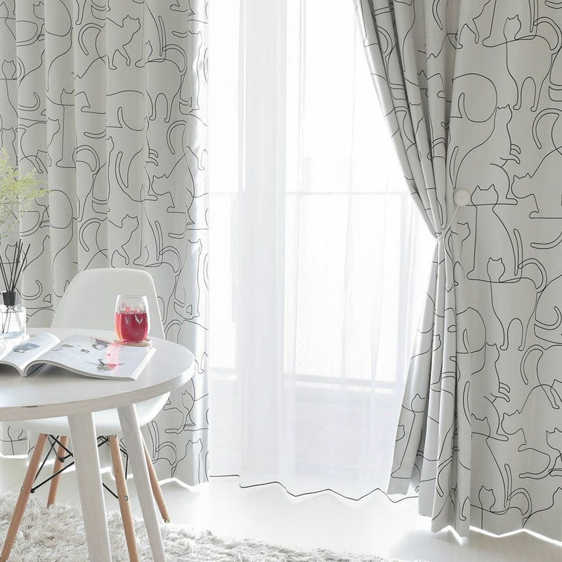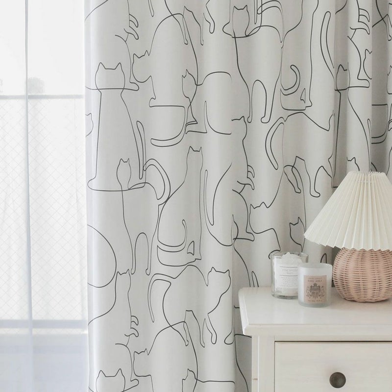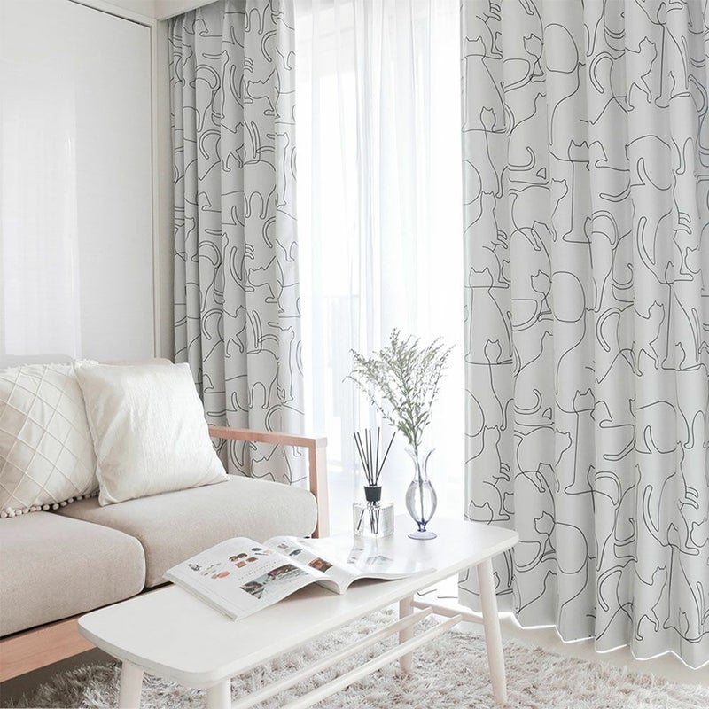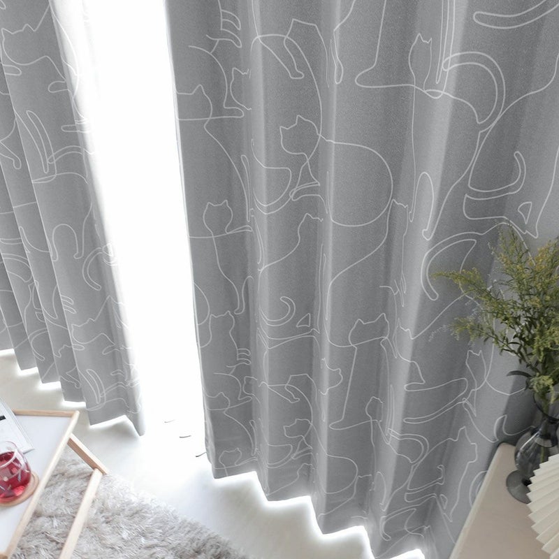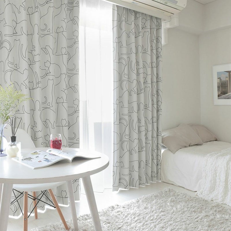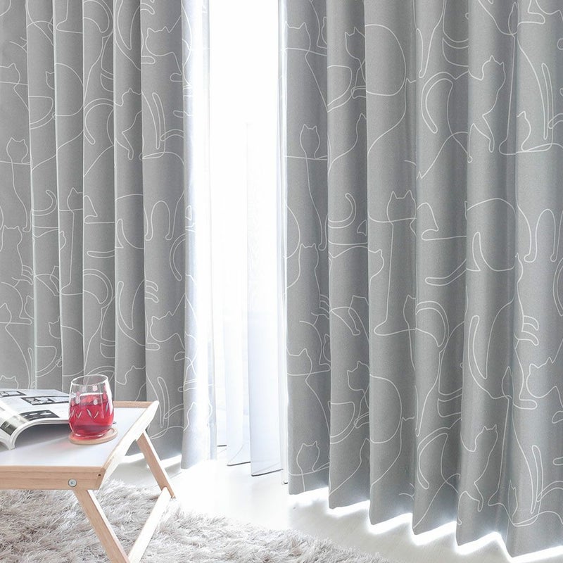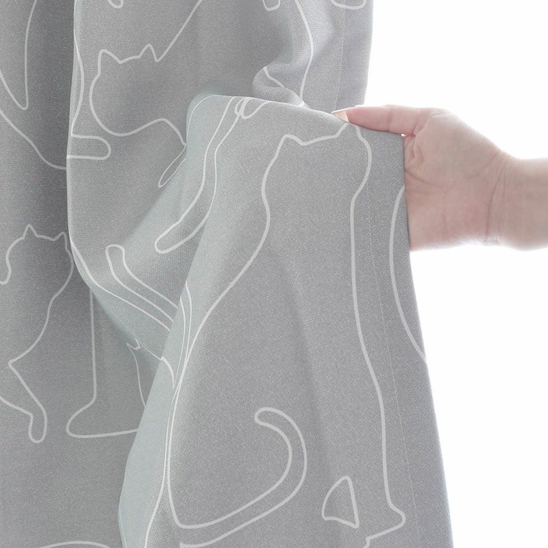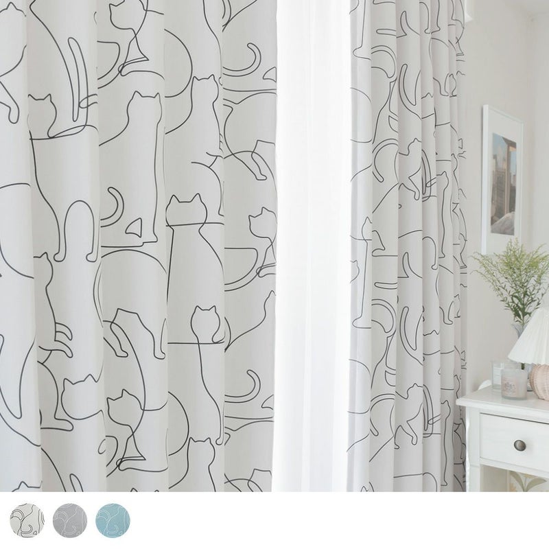ラインアートのように描いたネコ達がシンプルで可愛い1級遮光カーテン。柔らかな曲線のラインで、ネコ達の様々な動きを描き、可愛らしさと同時に躍動感を感じられるデザインのカーテンです。