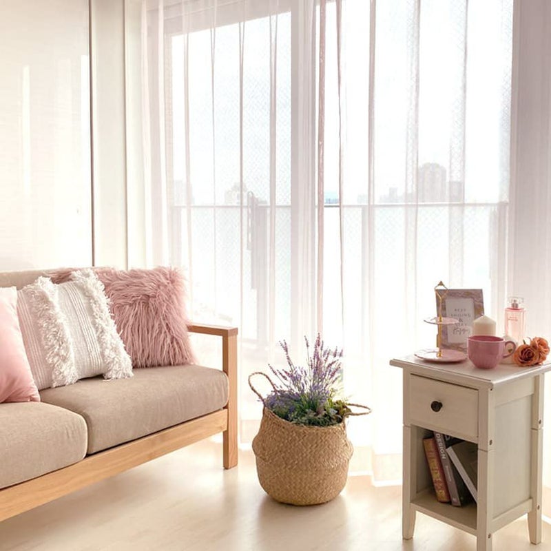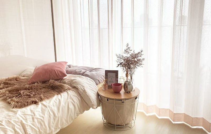 韓国スタイルインテリアではお花を飾ることが多く、柔らかいピンク色のレースカーテンとのコーディネイトは、とっても可愛いくておすすめです。