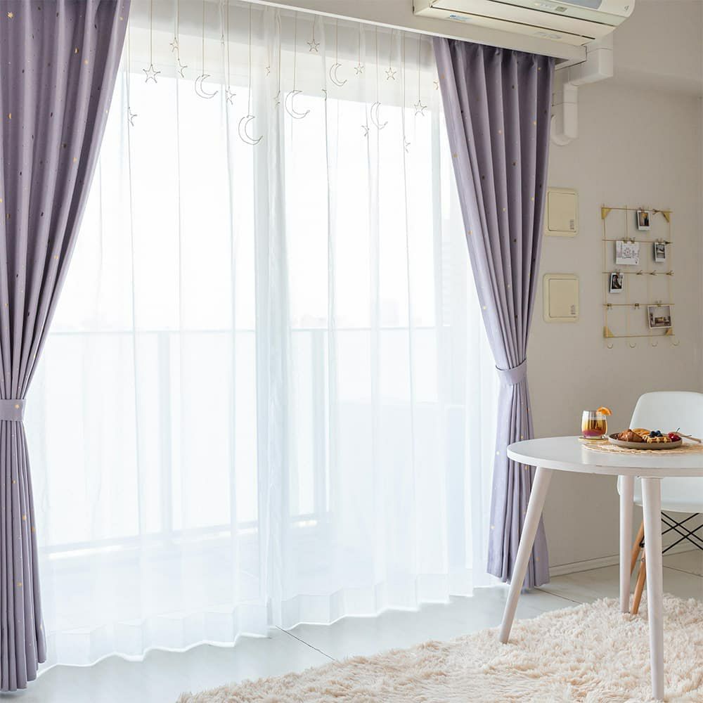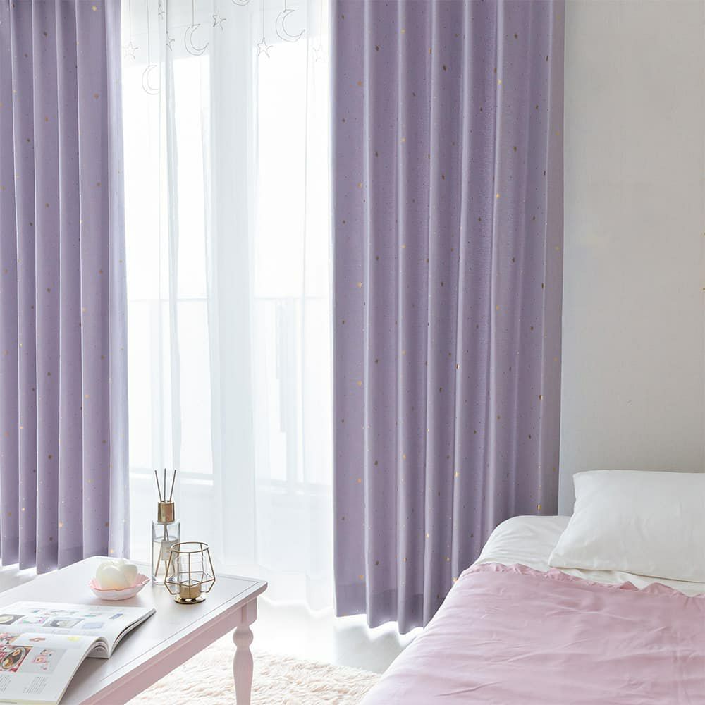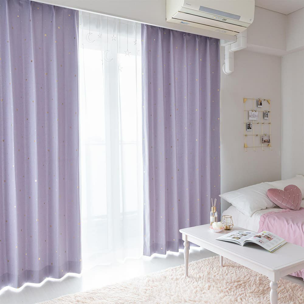 柔らかいバイオレットカラーの生地に、金色に輝く箔押しの星がポイント。ポップな韓国インテリアにピッタリなカーテン!