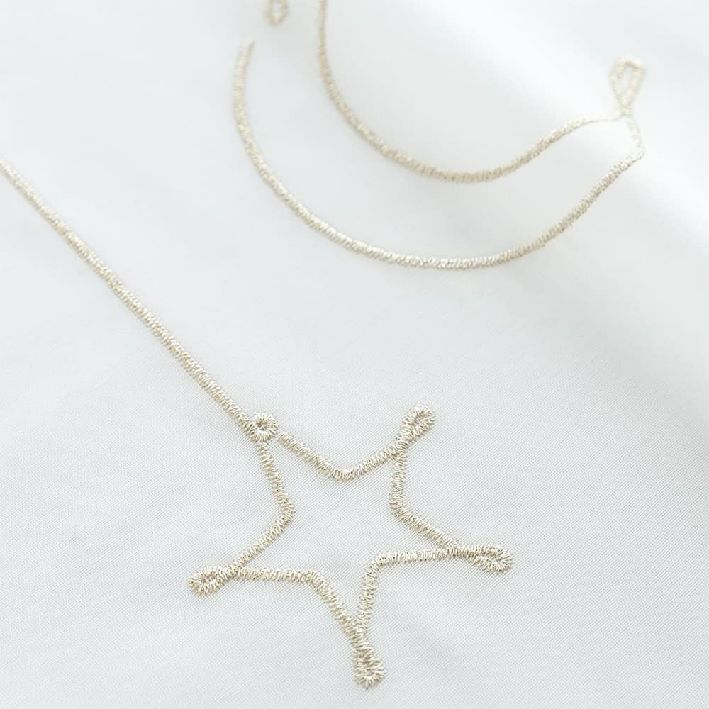ラメが入った糸で刺繍を施し、光に当たると美しくキラキラと輝きを増す。落ち着きのあるゴールドの刺繍と真っ白なレース生地の相性は100点!