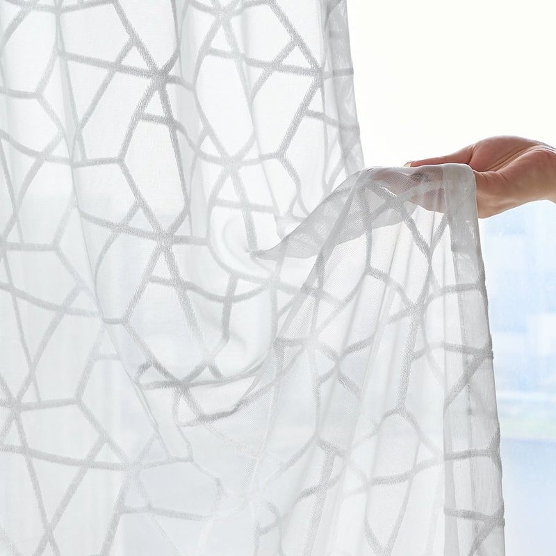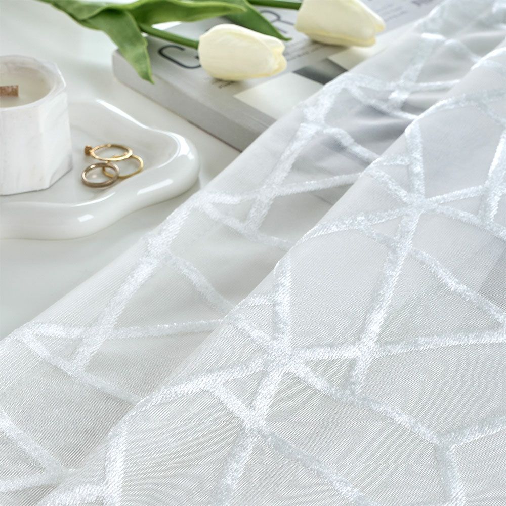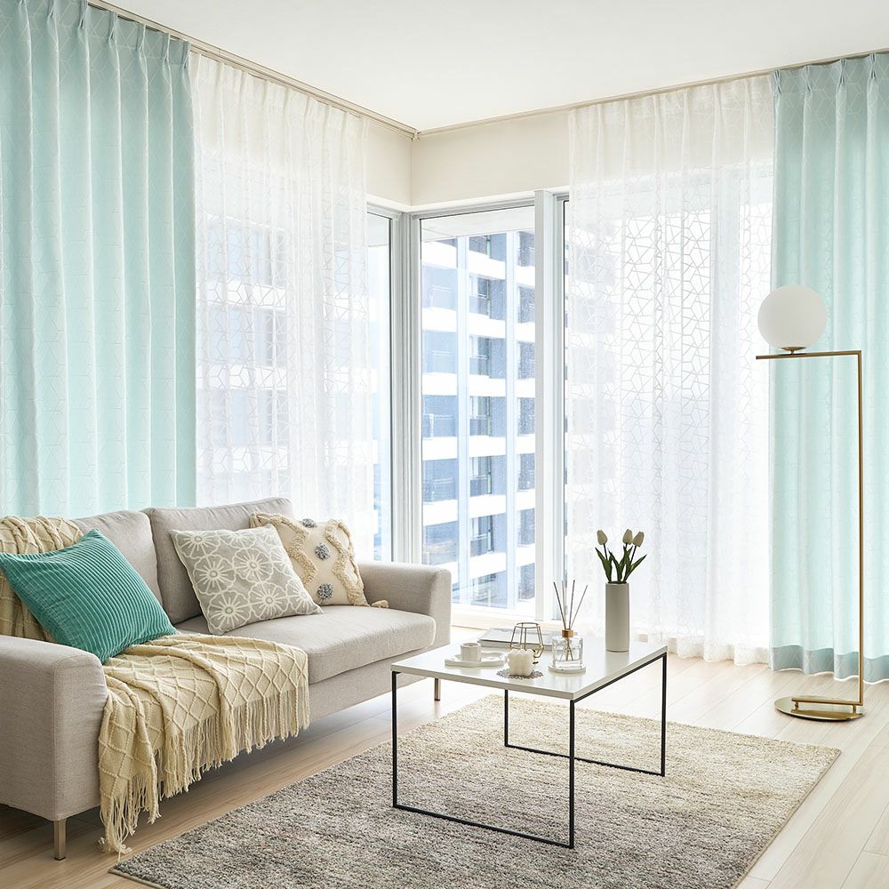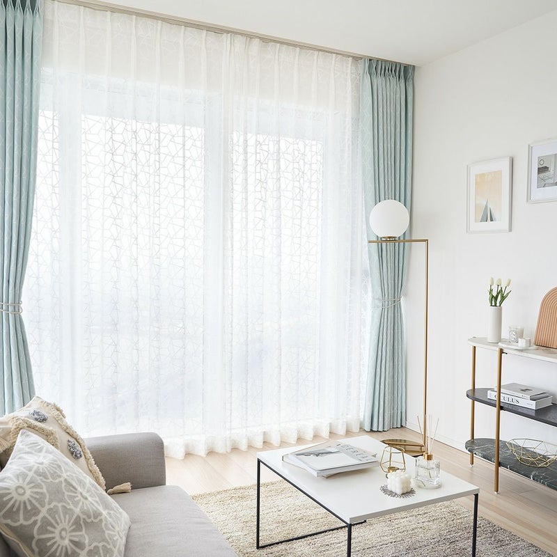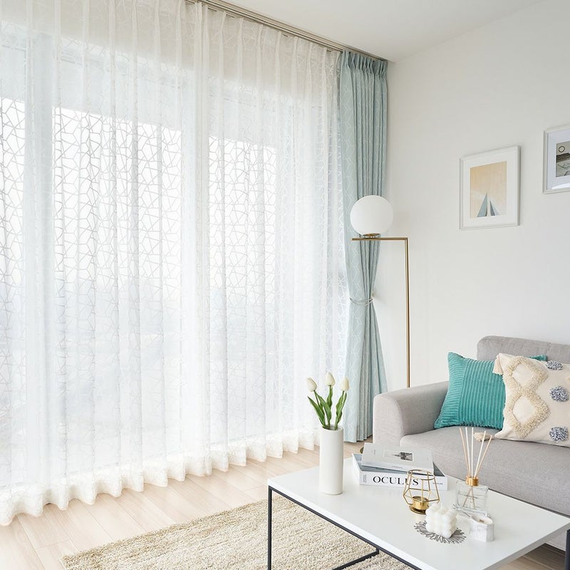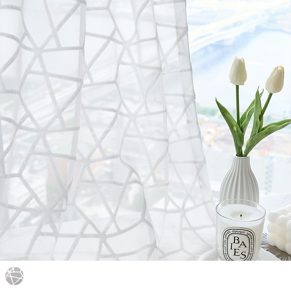 ベルベット素材で描かれた幾何学デザインが窓いっぱいに広がる、モダンでキュートなレースカーテン。どこかスタイリッシュな幾何学デザインは、大人の女性でも使いやすい甘すぎないお洒落さが良い!ホワイトインテリアでまとめて、ファブリックや小物で遊び心をプラスすれば、まるで本場の韓国のようなお洒落空間に。