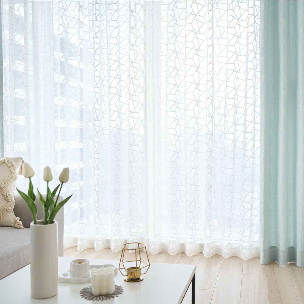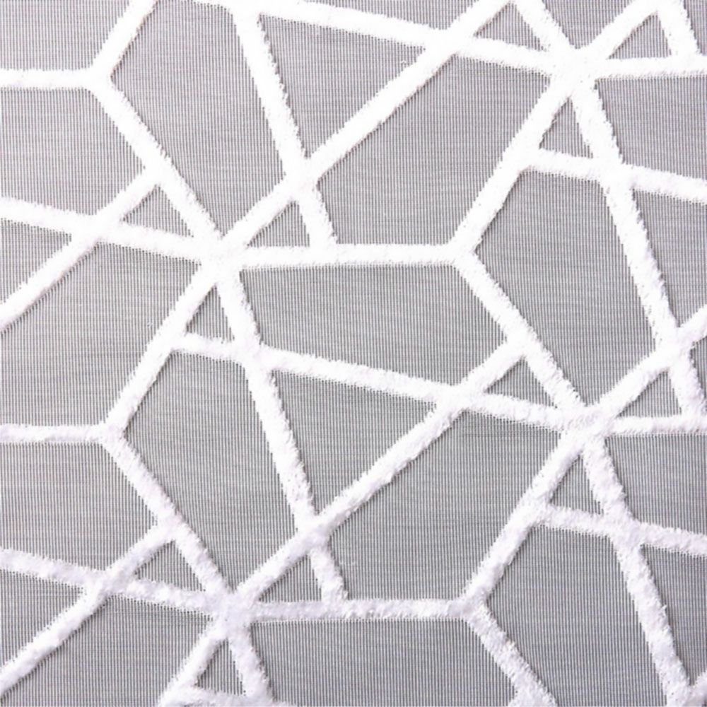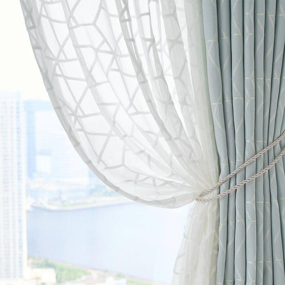 たっぷりと光を通す繊細なベース生地に、絶妙なサイズの幾何学デザインを施しました。軽やかなムードと、ぷっくりと浮かび上がるデザインたまらない。