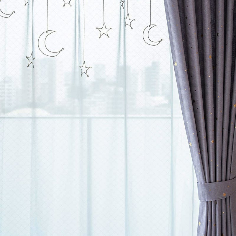 星と月を吊るしたデザインをカーテンの上部に刺繍で施し、まるでアートのようなレースカーテン。実は希少な上部のみのデザイン刺繍レース!出逢えたあなたは運命かも!?