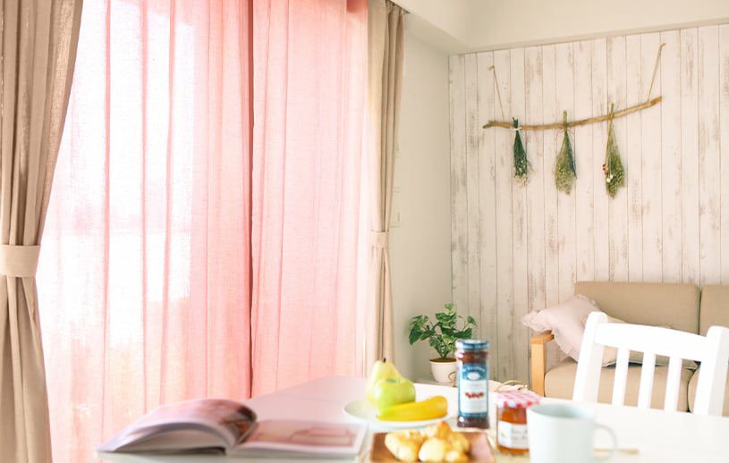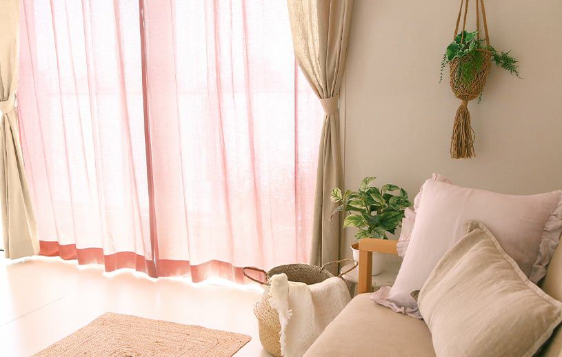 シャーベットカラーの天然素材カーテンで可愛らしいお部屋に。