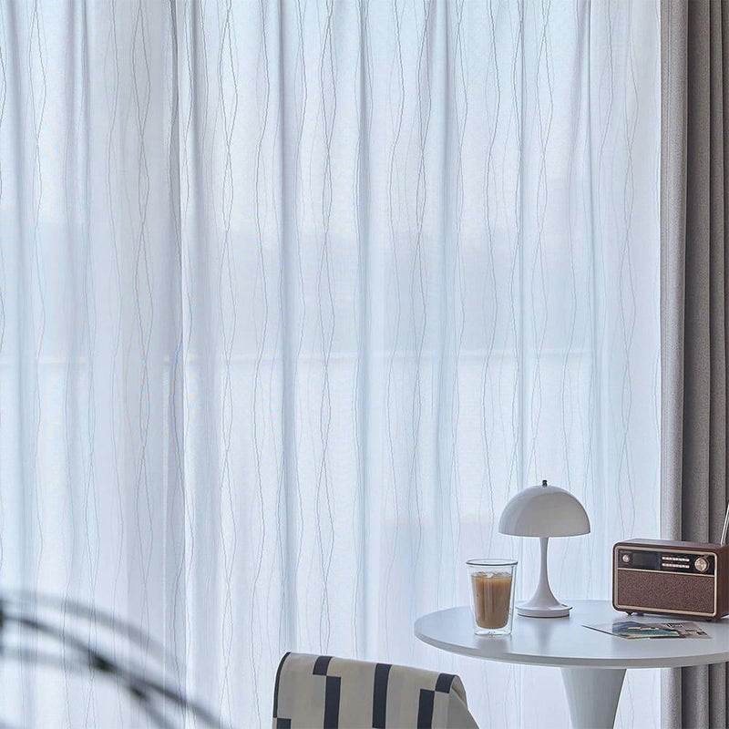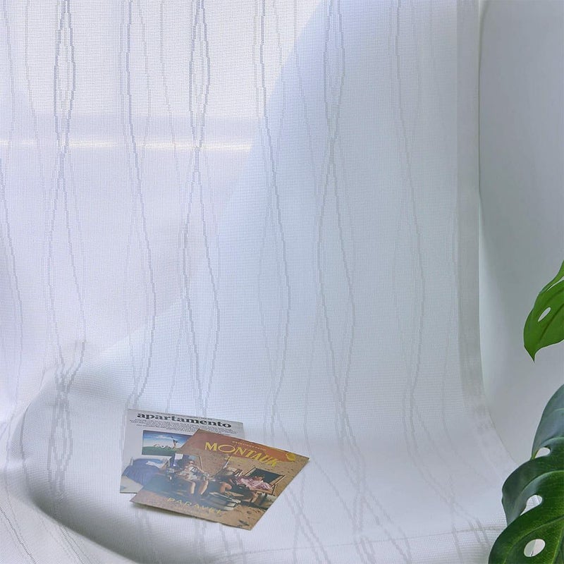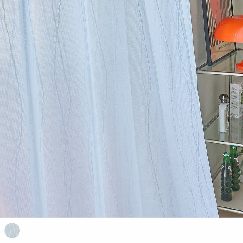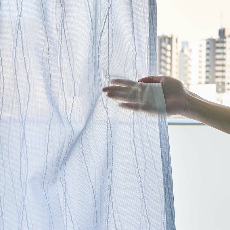 ピクセルアートのようなウェーブラインに遊び心くすぐられる、プライバシーレースカーテンです。 レトロでミッドセンチュリーな印象のデザインに、昼夜ともに透けにくい遮像・遮熱・UVカット・採光と安心機能を盛り沢山携えた、文句なしの1枚です。 -