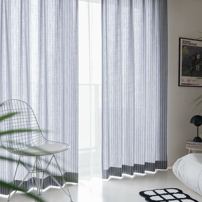 【撮影コーディネート】 レースカーテン :<コモン ホワイト>ジャケットを羽織るように、シンプルな空間を引き締めてくれる、綺麗めなストライプカーテンです。すっきりさせつつも、リネン風の素材感がラフな印象を演出。きっちりまとめたスタイリッシュな空間に、ほどよい抜け感をもたらす1枚です。