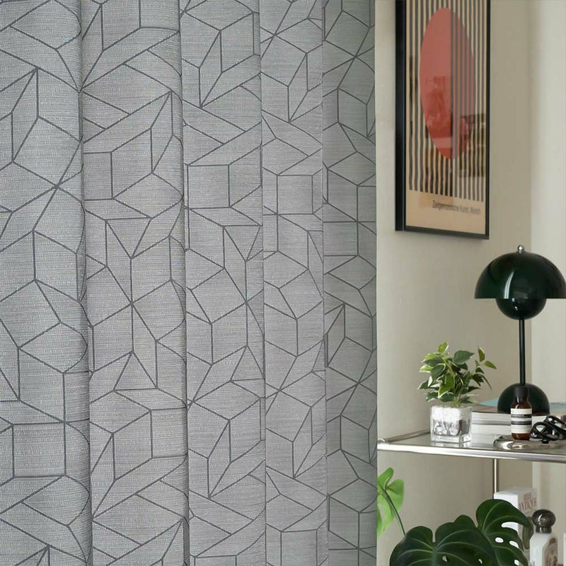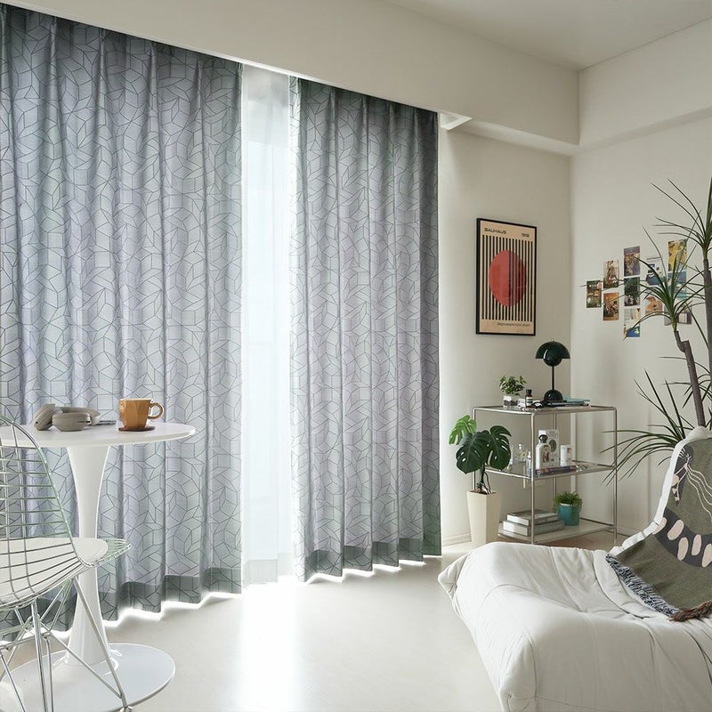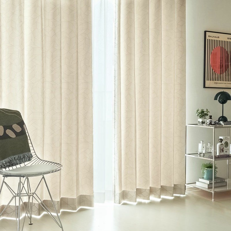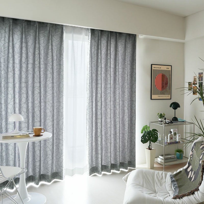 【撮影コーディネート】 レースカーテン :<サザナ ホワイト>「そう、ここが自分だけのアートギャラリー。」様々な形の立体をランダムに組み合わせた、アートチックな幾何学柄カーテンです。パズルのピースのようにパターンを組み合わせたデザインは、ジオメトリックデザインを愉しむミッドセンチュリースタイルとも相性抜群。窓辺全体にアートを飾るように、デザインを存分にお愉しみいただけます。