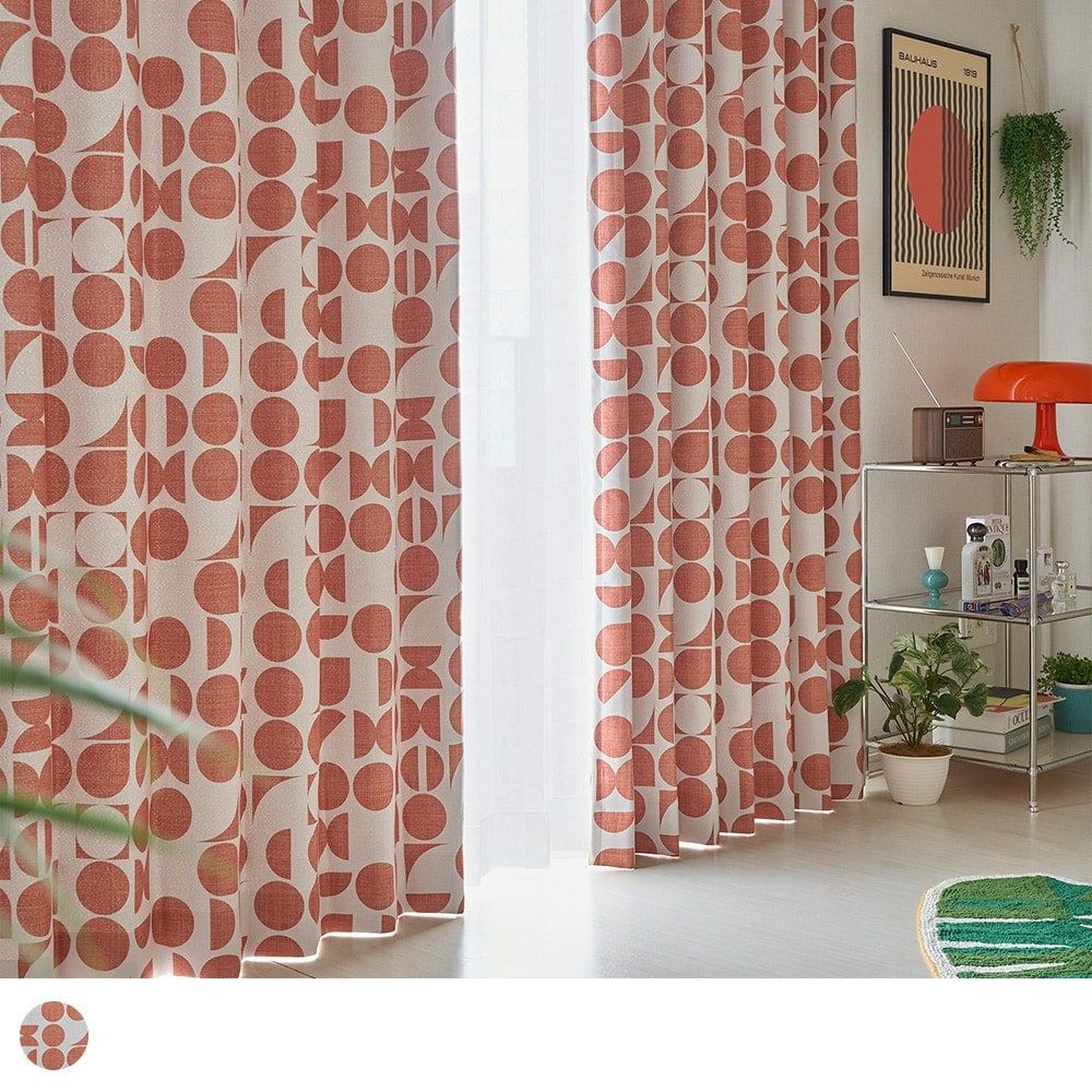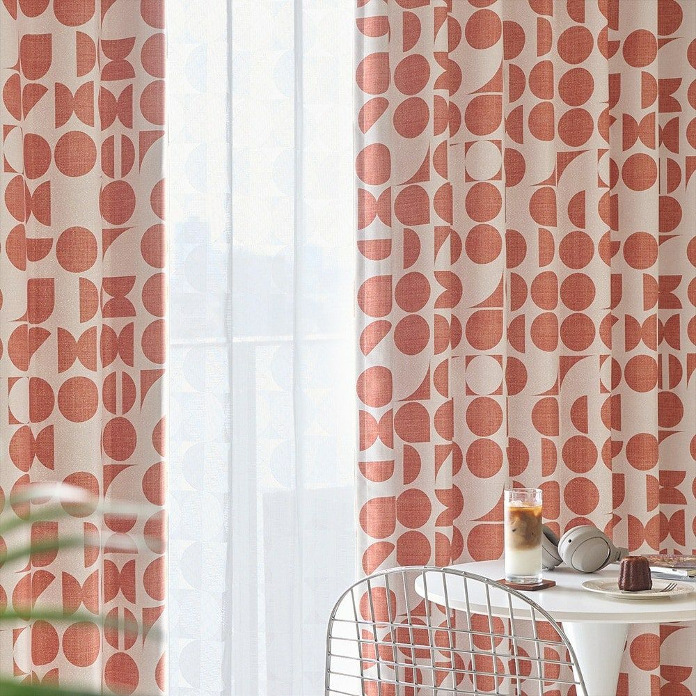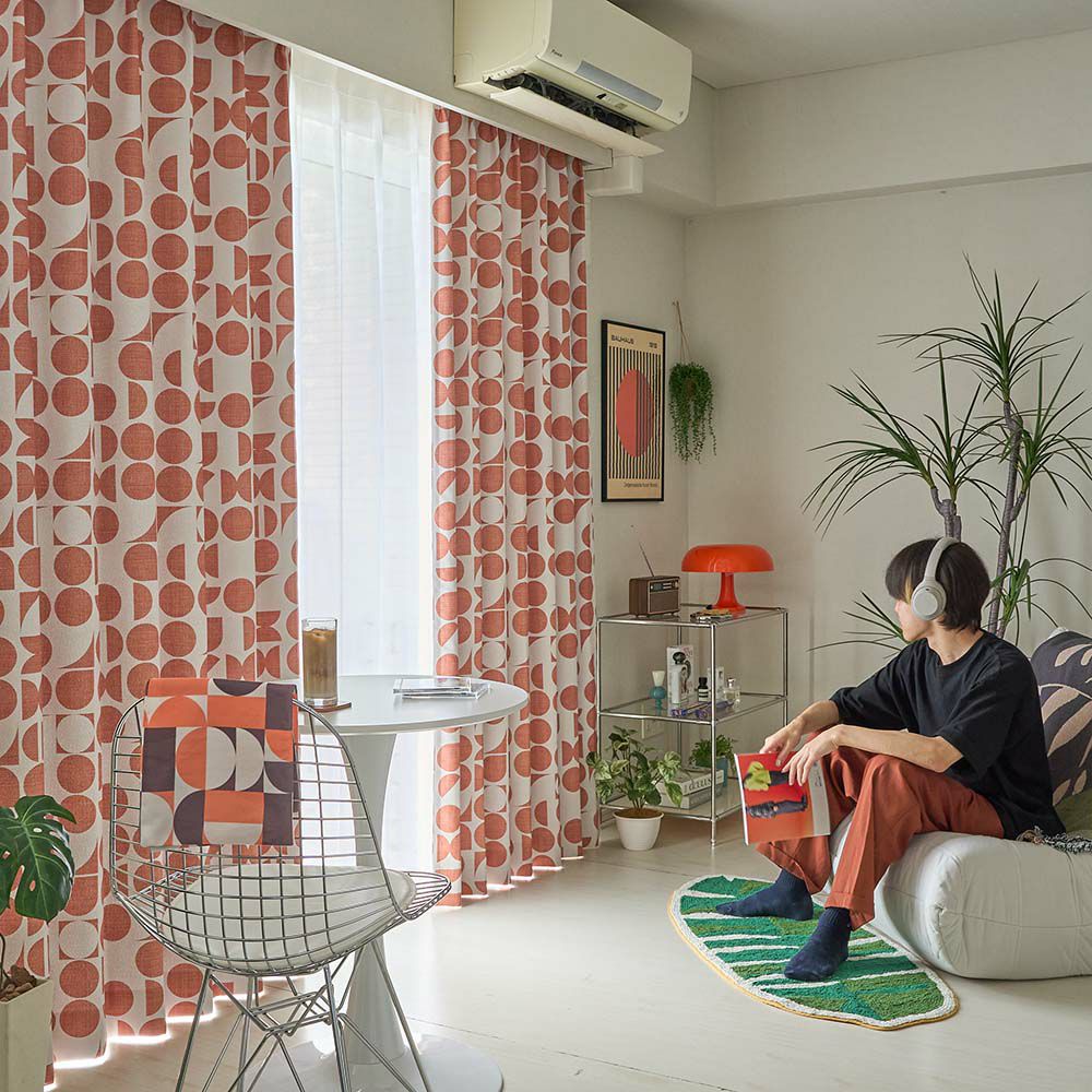 キノコランプや、エモーショナルなモダンポスターなどミッドセンチュリー期のレトロ感をミックスさせた韓国インテリア。現代人の趣向に刺さるレトロカフェのような雰囲気に、この幾何学柄カーテンは相性抜群です。