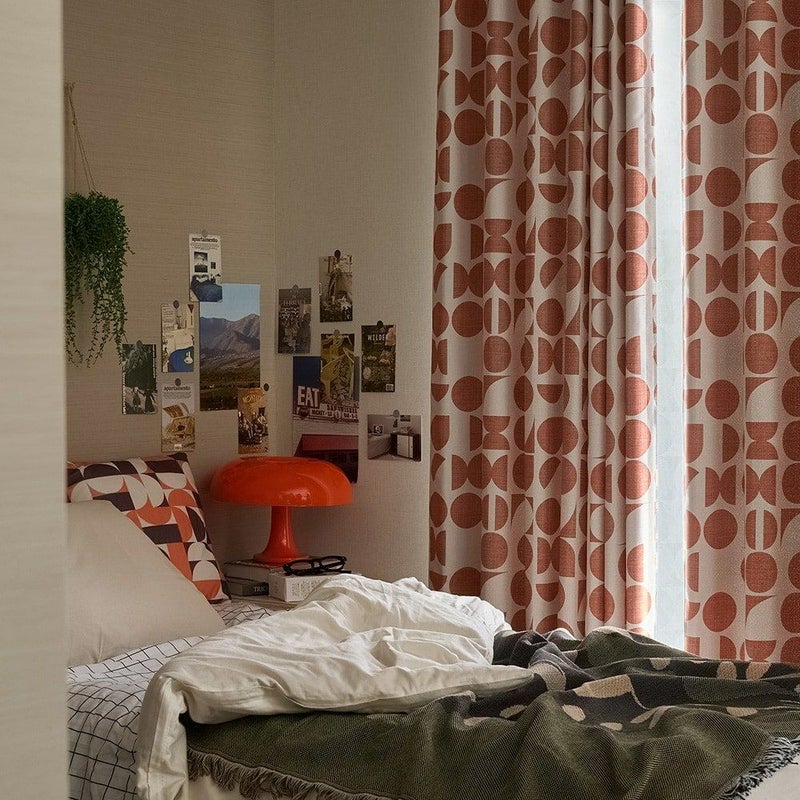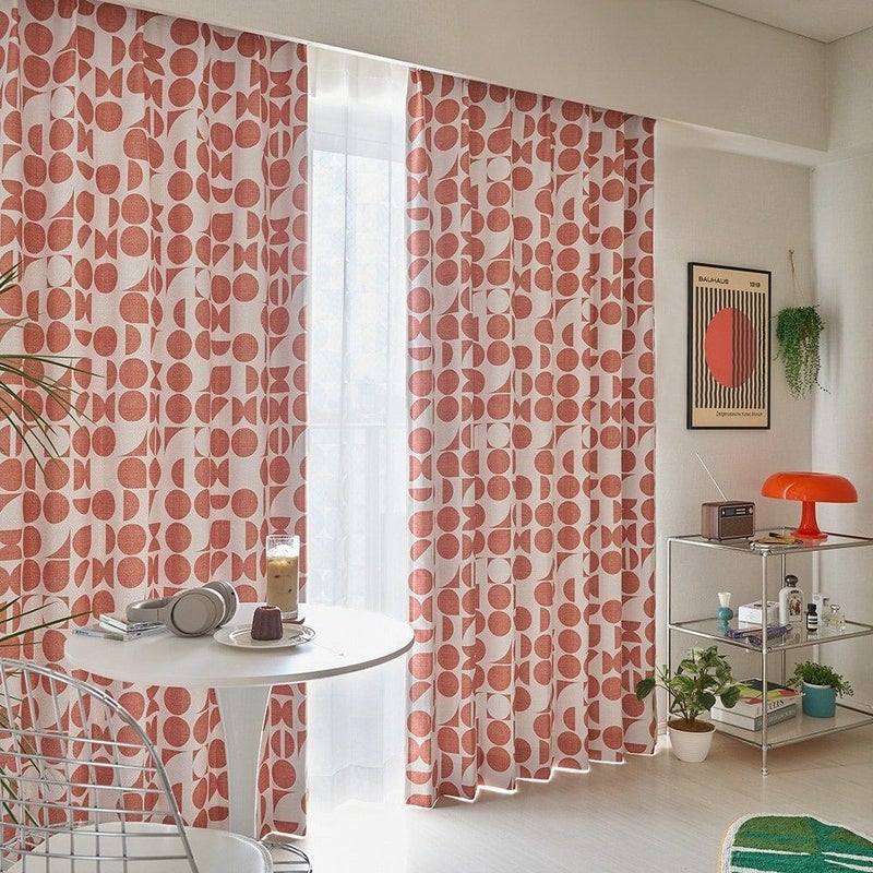 キノコランプや、エモーショナルなモダンポスターなどミッドセンチュリー期のレトロ感をミックスさせた韓国インテリア。現代人の趣向に刺さるレトロカフェのような雰囲気に、この幾何学柄カーテンは相性抜群です。