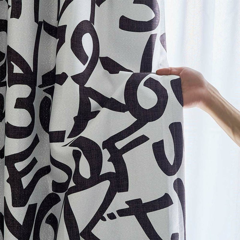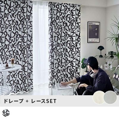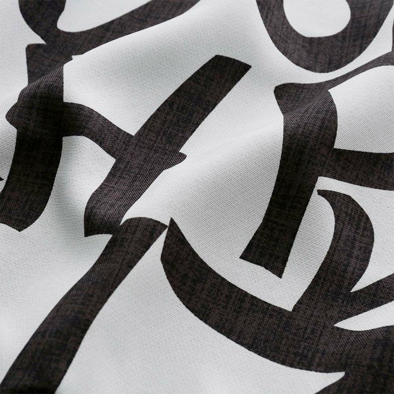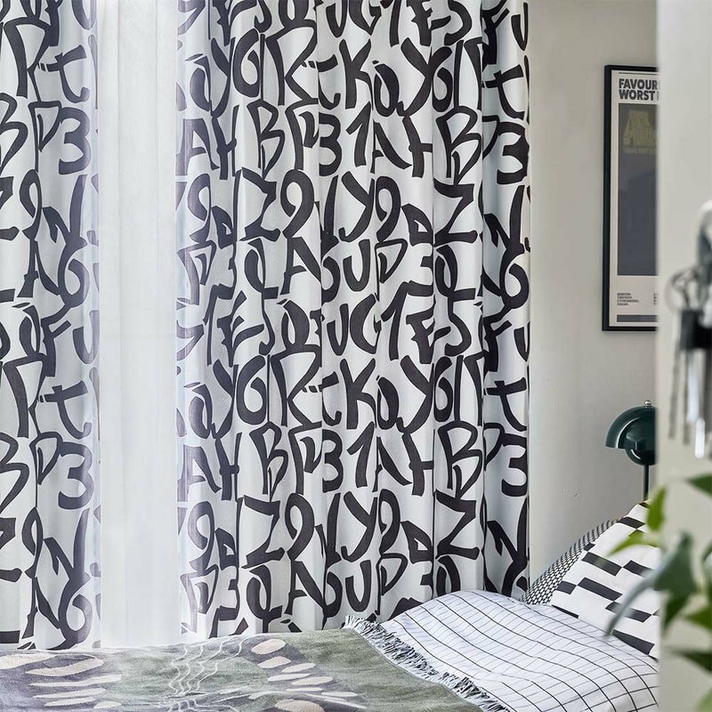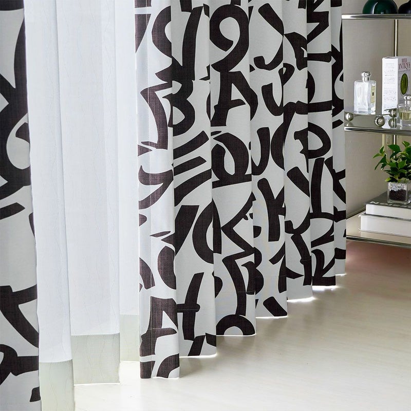 シンプルな手書き風の文字を、カーテン一面にダイナミックにデザインした遮光カーテンです。 シンプルながらも目新しさも感じさせる、ありそうでなかったデザインに仕上げました。窓に吊るすだけで、つい自慢したくなるような、無機質なモノトーンカフェ風インテリアに早変わり。