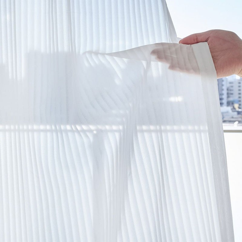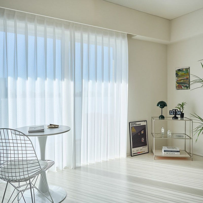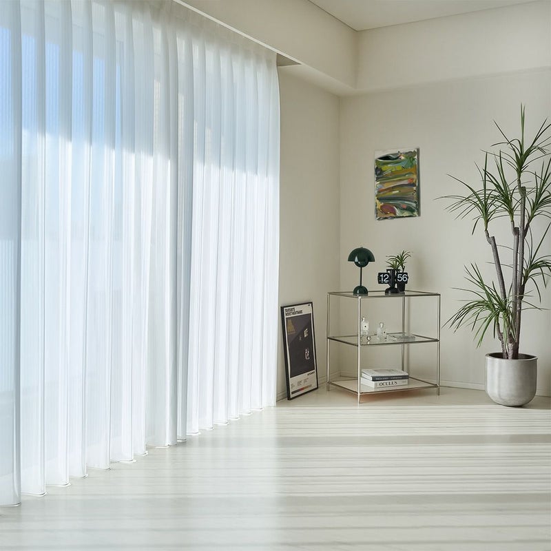 揺れる影がまるで物語の一場面のように、日常の一瞬をドラマチックに彩ります。 スタイリッシュで静けさを纏った、韓国モダンインテリアに似合うレースカーテンです。 -