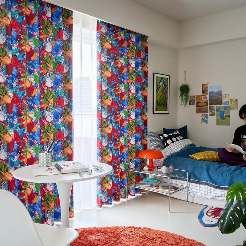 ギャラリーのようにアートを点在させれば、カーテンにさえもアートを詰め込んだ、心を満たす部屋の完成です。カラフルポップを存分に楽しむ、自分だけの特別なアトリエに。