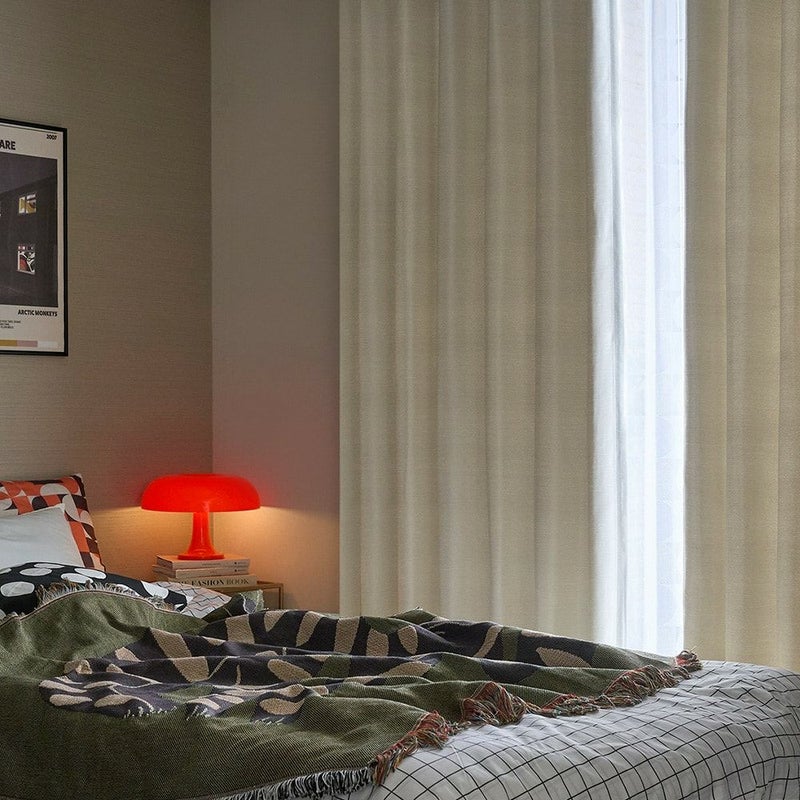 無機質なアイテムをベースに、どこか懐かしい温かみのあるオーダーカーテン「アナログ」をミックスさせて、エモい雰囲気が漂う韓国インテリアに。ぜひこのカーテンを手に取って、あえてアナログ感を愉しむ、心の余裕を生み出す空間作りをしてみてください。