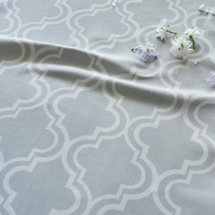 モロッカンランプのような、曲線美が魅力のコラベルタイル柄。幾何調にデザインすることで洗練されたシックなテイストに仕上がりました。光沢のある生地感がきれい目な印象に。