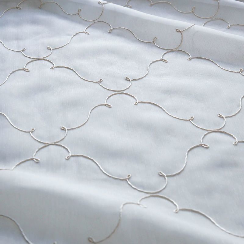 モロッコの伝統的な装飾に使用されているコラベルタイル柄。ランタン柄やモロッカンタイル柄などとも呼ばれ、日本で「モロッカン柄と言えば、まず思い浮かべるのがこの柄」と言えるほど大人気の柄です。 そんなコラベルタイル柄を、少し光沢のあるシャンパンゴールド色の糸で贅沢に刺繍を施した、とても魅力的なレースカーテンができました。