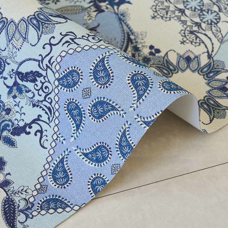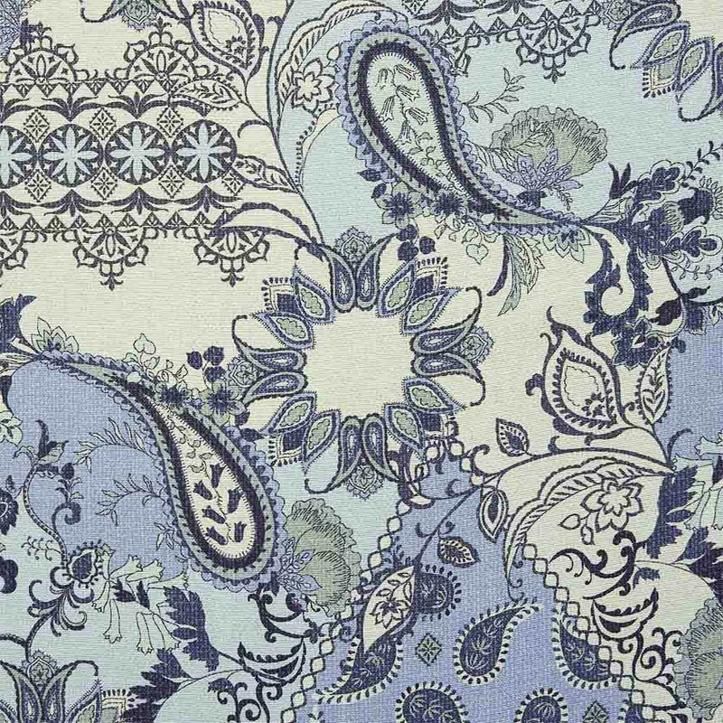繊細に描かれた大小のペイズリー柄と、規則的に並ぶタイル柄が散りばめられた装飾性のあるデザイン。まるで、アラビアの宝石箱を開けるかのようなドキドキがぎゅっと詰まったテキスタイル。流れるように連なる黒のラインが、エキゾチックなムードを引きたてます。