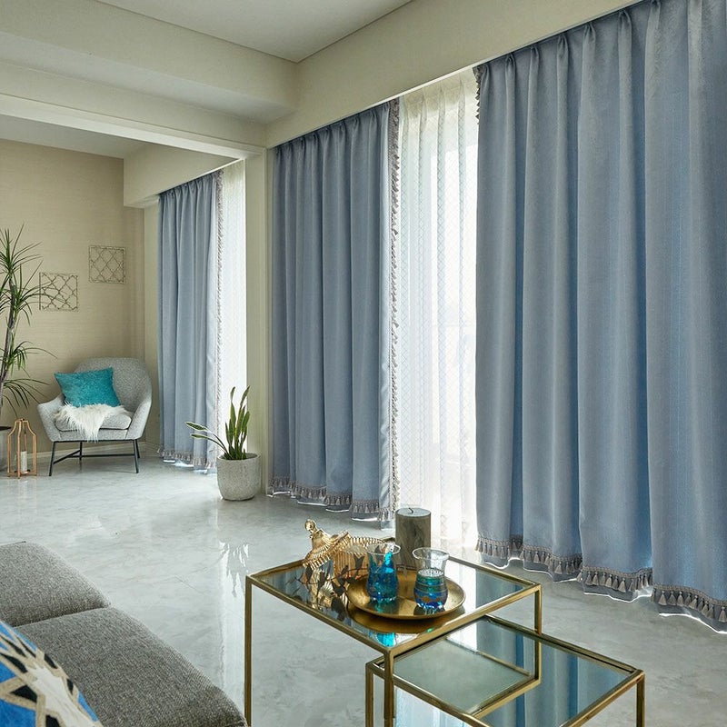 見た目の美しさもさることながら、実用性へのこだわりもしっかり詰まった「ロザリアフリンジトリム」。フォグブルー、ミストパープル、マルベリーは1級遮光で光をしっかりと遮ります。パールグレーとアクアは2級遮光。カーテンのやわらかな色合いを楽しみながら、プライバシーを守ってくれる絶妙なバランス感。
