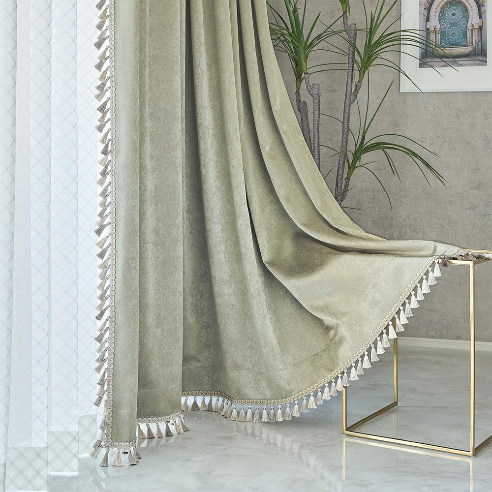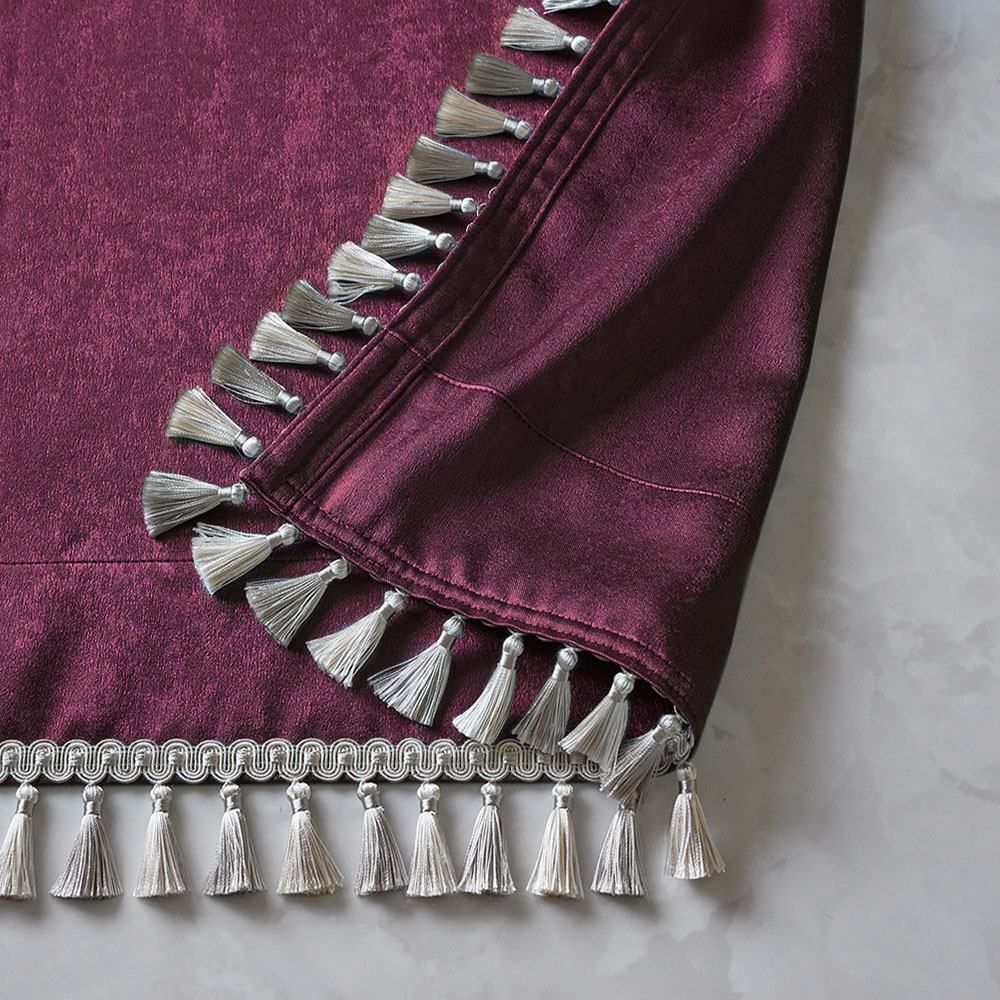 しっとりと艶めくピーチスキンタッチの生地に、贅沢にあしらったフリンジトリムが揺れる。まるで、モロッコのリヤドに迷い込んだかのような、静かで異国情緒に満ちたリラックス空間を演出します。カーテンを閉じた瞬間、外の世界とゆるやかに隔てられ、あなただけの非日常へと誘います。