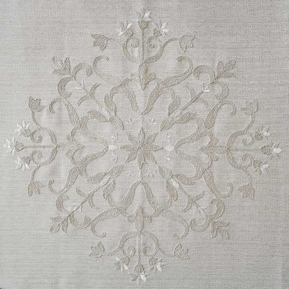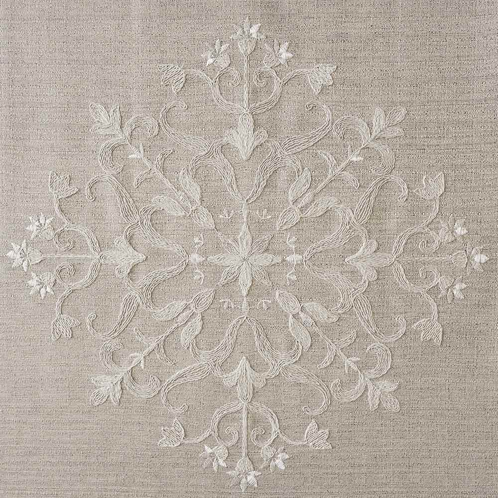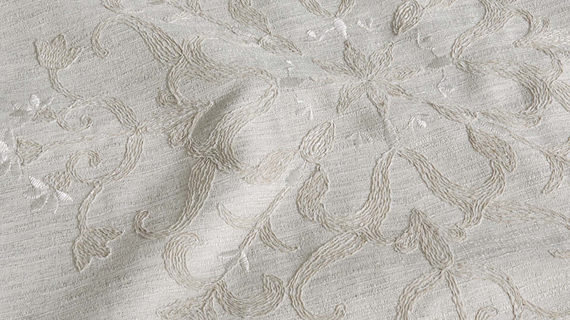大胆な大きさのオーナメント柄の刺繍が、オリエンタルな雰囲気をいっそう引き立てます。更に、繊細な刺繍糸が描き出すオーナメントは、立体的な陰影を生み、深みのある優美な表情を醸し出します。
