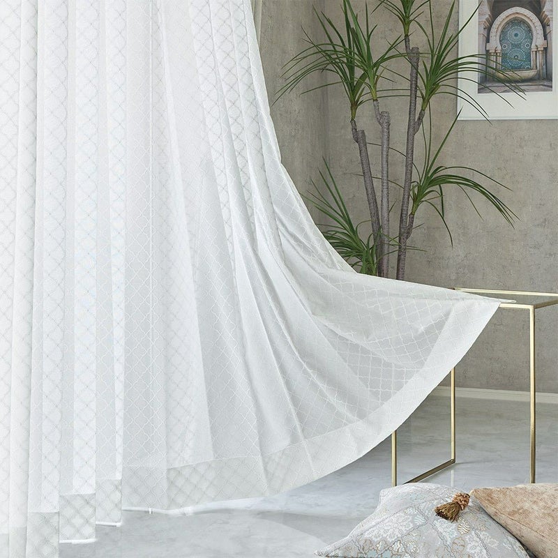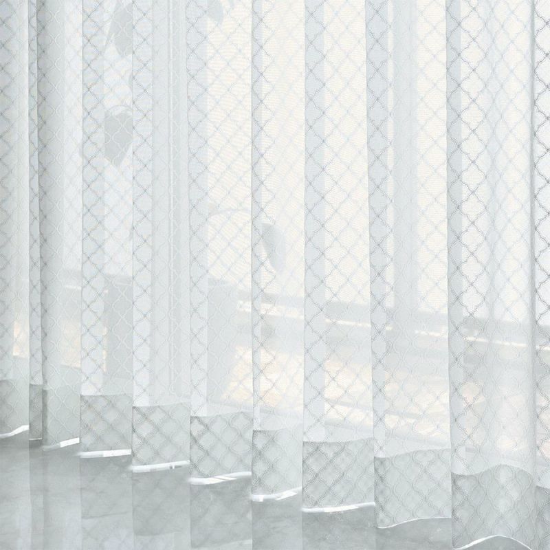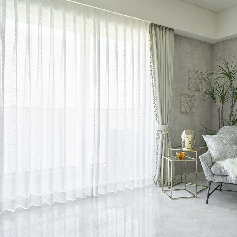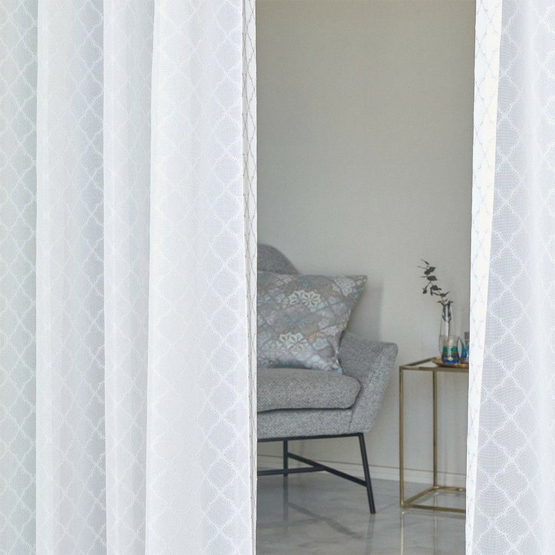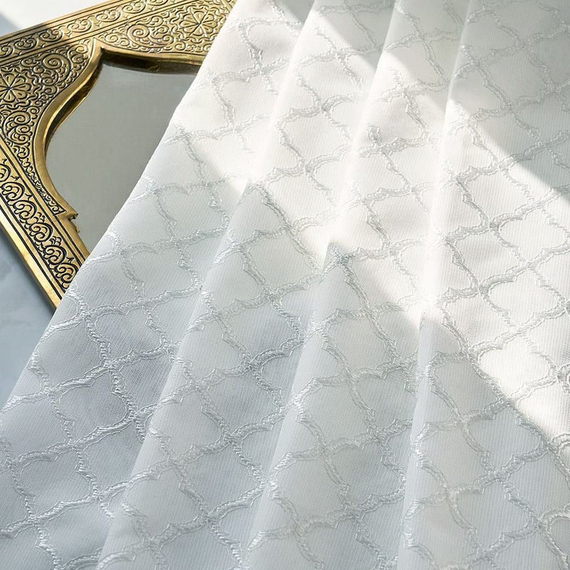 伝統的なモロッカンタイルの幾何学模様を、ラッセル編みで美しく表現。まるで刺繍のような立体感のある仕上がりで、シンプルな窓辺に華やかさをプラスします。光が差し込むたび、模様が浮かび上がる瞬間が特別な光景に。