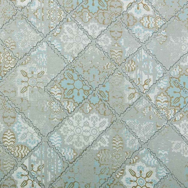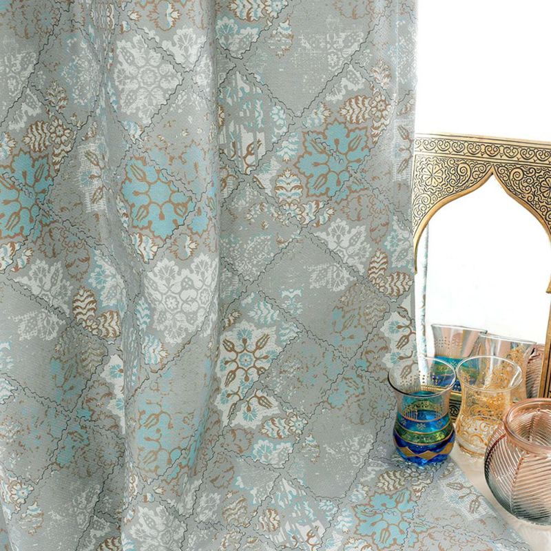 色味は、グレー地にエメラルドとゴールド、ホワイトの配色。光沢のある織り糸が重なってキラキラと光って見え、細い刺繍糸のような黒の枠線も、模様を目立たせて立体感を出してくれます。 少しかすれている模様部分はモロッコの歴史を感じさせてくれるような、新しさの中にも古風な雰囲気が感じられる当店オリジナルカーテンです。