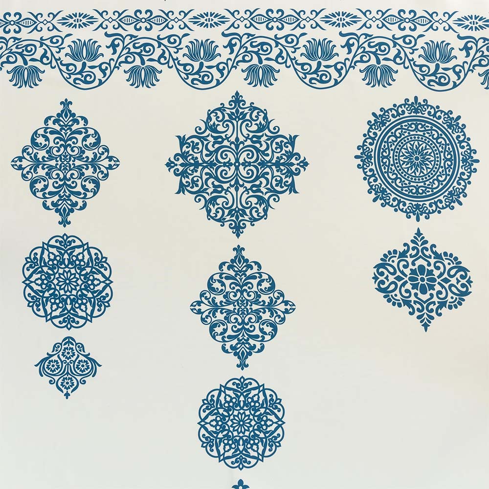 モロッコの「リヤド」を連想させる上品さと、ブルーで描かれたアラベスク模様のような華やかなデザイン。こちらは上絵羽柄と呼ばれる、上部だけにデザインを施した、オーダーカーテンならではの1枚。ガーランドのようなデザインは、まるでお部屋の飾り付けのようではないでしょうか? -